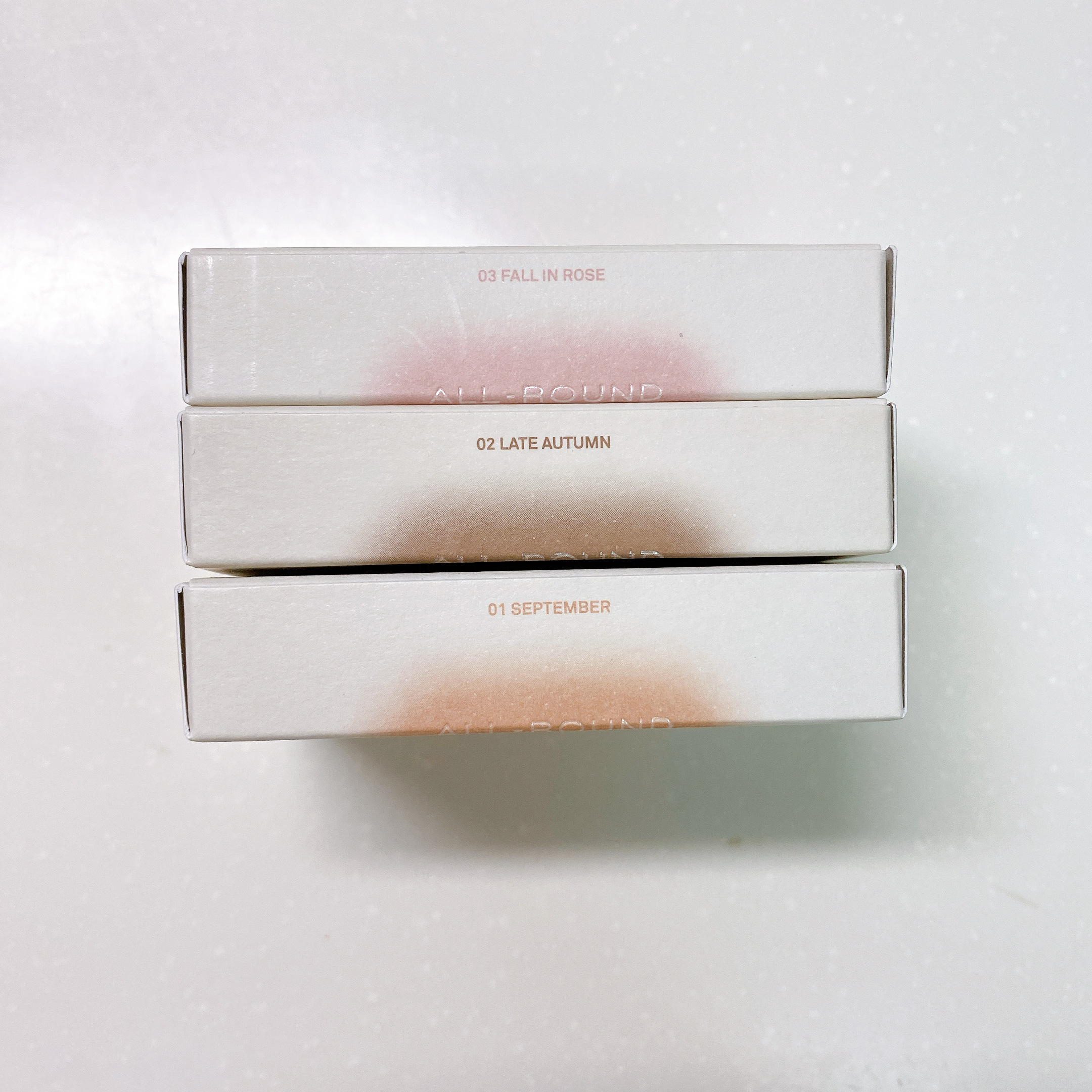 - <01 セプテンバー> マイカ、ジメチコン、ジフェニルシロキシフェニルトリメチコン、水添ポリ(C6-14オレフィン)、トリエチルヘキサノイン、リンゴ酸ジイソステアリル、ホウケイ酸チタンカルシウム、ポリメチルシルセスキオキサン、ジメチコン/ビニルジメチコンクロスポリマー、ラウロイルリジン、ミリスチン酸マグネシウム、HDI/トリメチルロールヘキシルラクトンクロスポリマー、エチルヘキシルグリセリン、カプリリルグリコール、シリカ、酸化スズ、トコフェロール、硬化植物油、ペンタエリスリチルテトラ-ジ-t-ブチルヒドロキシヒドロ桂皮酸、ソルビタントリステアレート、二酸化チタン(CI 77891)、酸化鉄(CI 77491) <02 レイト・オータム> タルク、マイカ、シリカ、トリエチルヘキサノイン、トリイソステアリン酸ポリグリセリル-2、ジメチコン、フェニルトリメチコン、水添ポリイソブテン、ステアリン酸亜鉛、トリエトキシカプリリルシラン、エチルヘキシルグリセリン、カプリリルグリコール、マグネシウム/カリウム/SIリチウム/フッ化物/水酸化物/酸化物、水酸化アルミニウム、メチコン、イソプロピルチタントリイソステアリン酸、ミリスチン酸、トコフェロール、二酸化チタン (CI 77891)、酸化鉄 (CI 77491)、酸化鉄 (CI 77492)、酸化鉄 (CI 77499) <03 フォール・イン・ローズ> ホウケイ酸チタンカルシウム、スクワラン、マイカ、ポリプロピレン、リンゴ酸ジイソステアリル、テトラエチルヘキサン酸ペンタエリスリチル、ホウケイ酸アルミニウムアルミニウム、シリカ、ラウロイルリシン、窒化ホウ素、ステアリン酸亜鉛、水添スチレン/イソプレンコポリイメール、酸化スズ、エチルヘキシルグリセリン、カプリリルグリコール、ペンタエリスリチルテトラ-ヒドロキシヒドロ桂皮酸ジ-t-ブチル、トコフェロール、硬化植物油、トリステアリン酸ソルビタン、二酸化チタン (CI 77891)、銀 (CI 77820)、酸化鉄 (CI 77491)