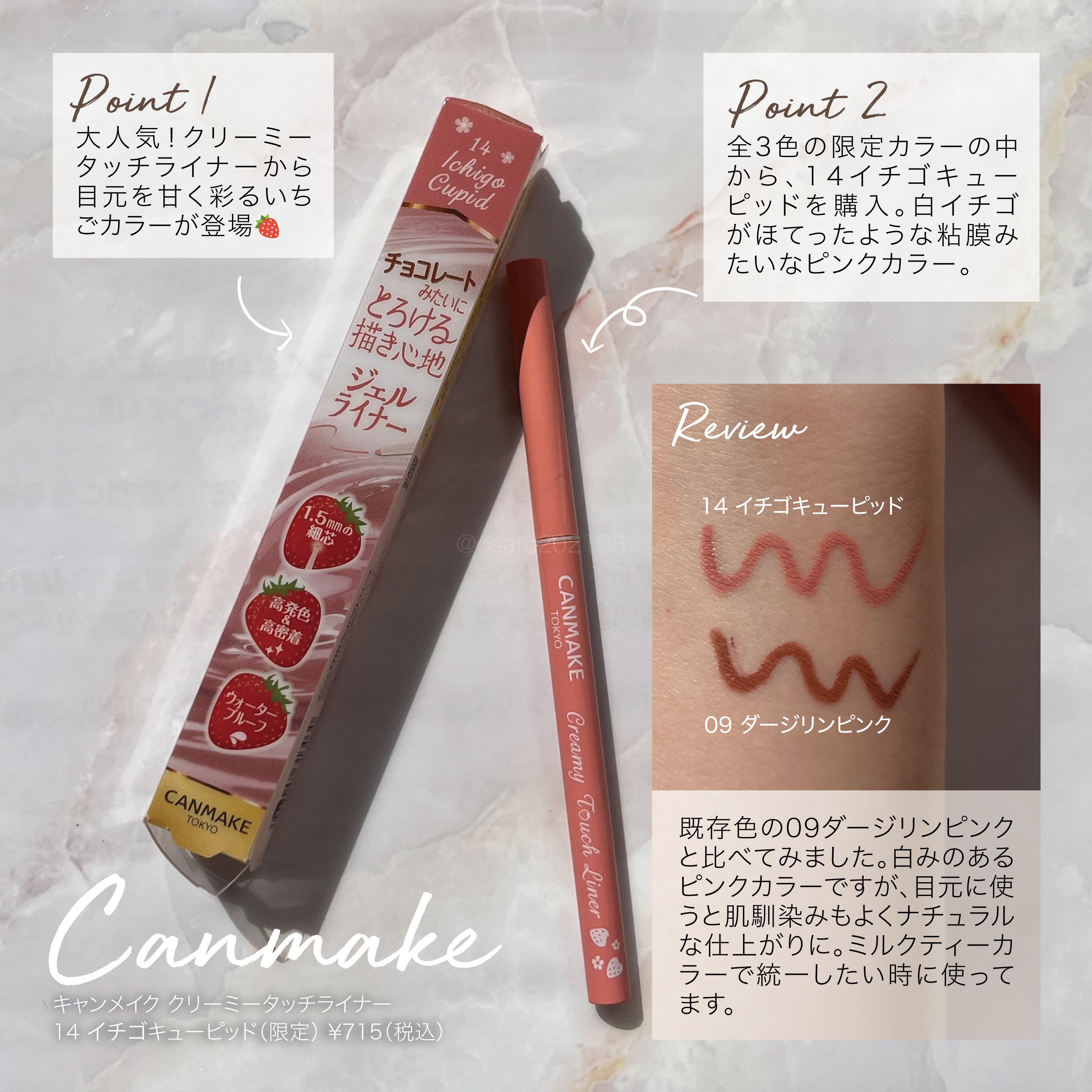 キャンメイクアイバックコンシーラー04涙袋に塗るのですが、まさかの浮かない!自然的に涙袋がかけちゃう優れ物です💕キャンメイククリーミータッチライナー14可愛い濃いピンク色で塗ると色が浮く事が無くて自然的にピンクで使用しやすいです🩷キャンメイク...