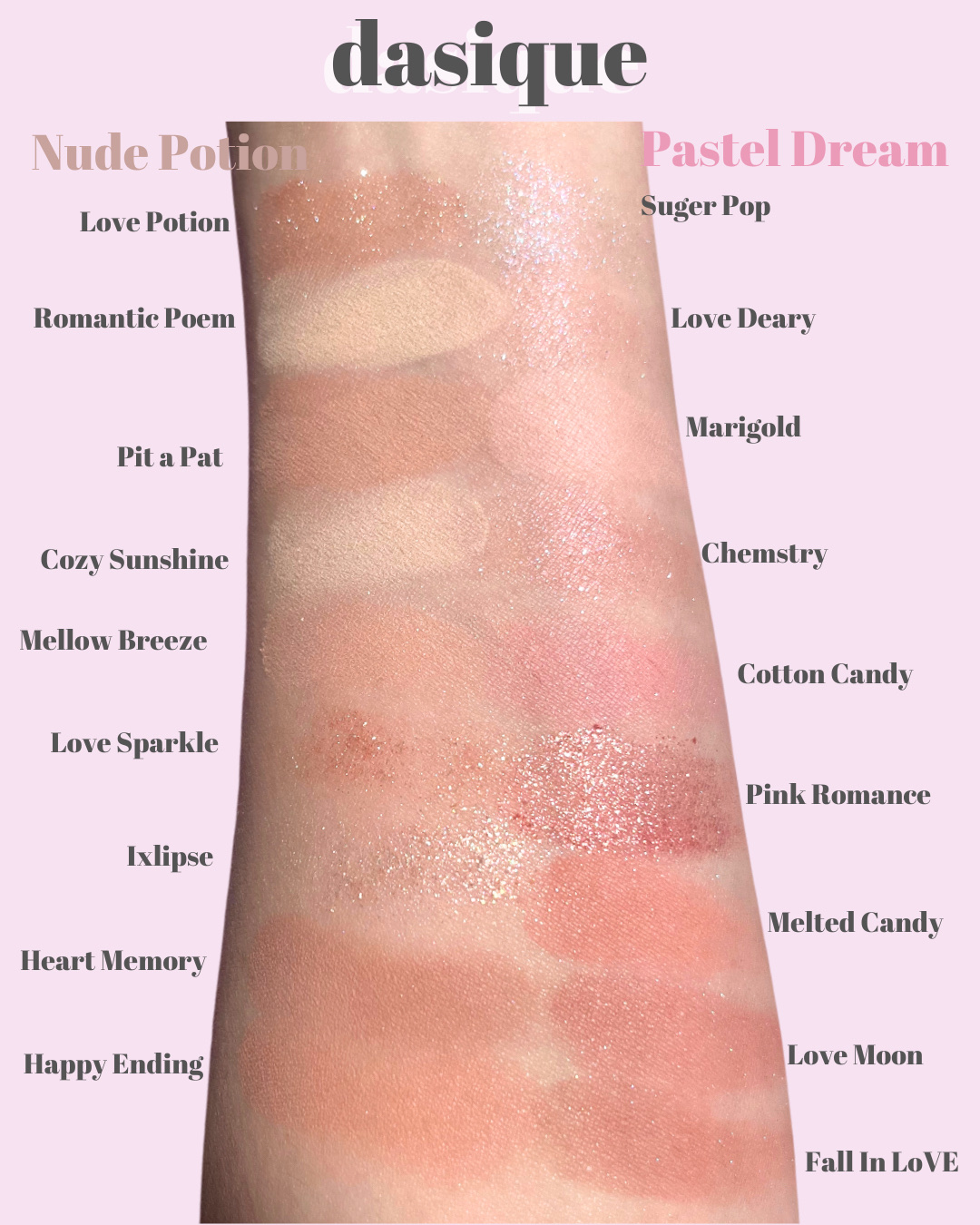- 【舞台上のバレリーナの繊細な動きと抑制された美しさを再解釈した、dasiqueならではのバレエコアコレクション】 シマー、マット、パールなどバリエーション豊かなテクスチャーで、軽やかにまぶたにフィット。粉飛びしにくく、指先で簡単に美しい仕上がりが叶います。 柔らかいピンクベースから深みのあるシェードまで揃い、1つのパレットで普段使いのデイリーメイクから特別な日の華やかメイクまで幅広く楽しめます。 - 活用しやすいテクスチャーとカラーバリエーションで毎日新しいムードを完成してくれるデイジーク シャドウパレット。 デイリーメイクからポイントメイクまで演出が可能。 感覚的な9種類の色味でムードUP! 多彩でウェアラブルなテクスチャーで高い活用度!