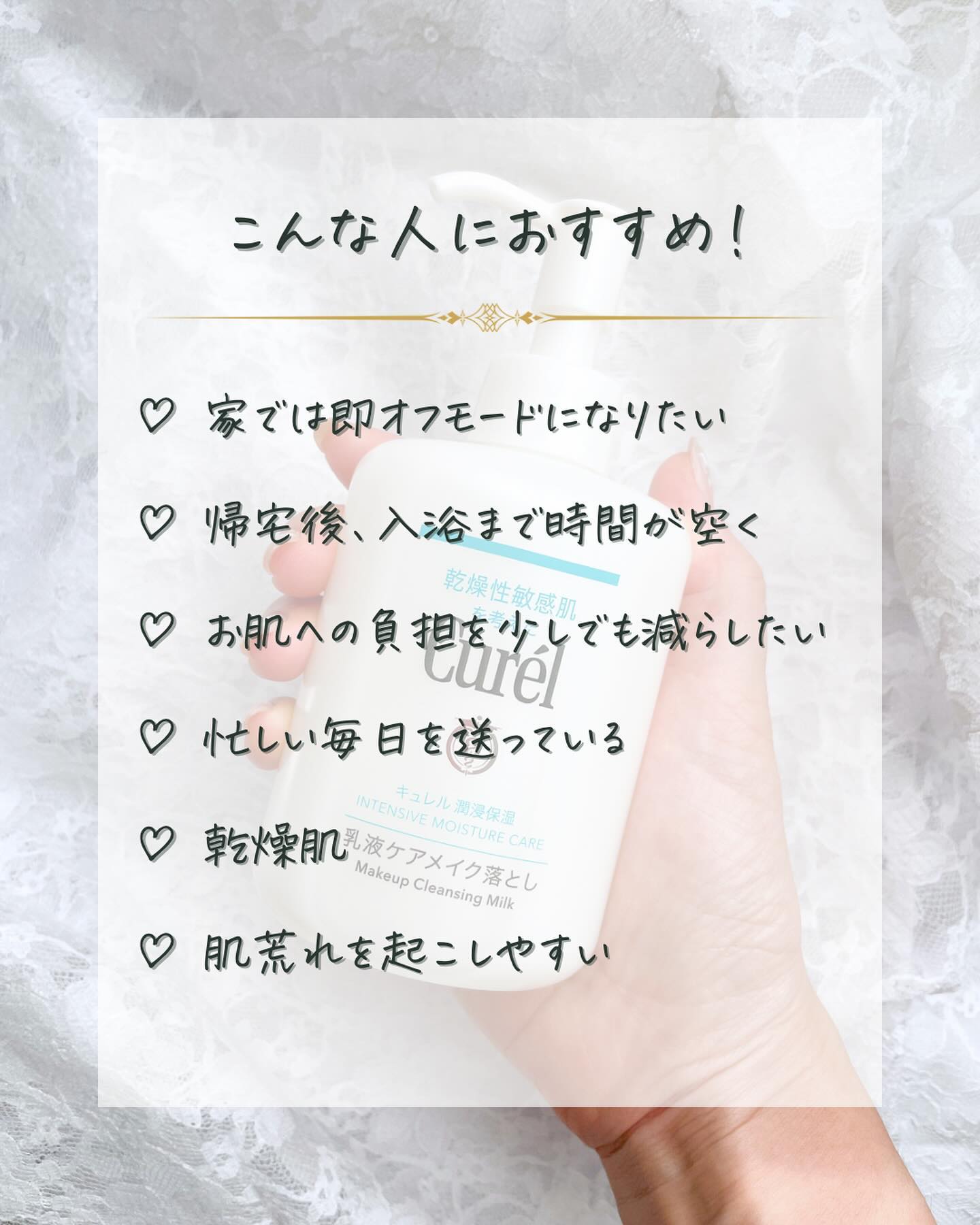 - 【敏感肌用】【医薬部外品】 乳液でメイク汚れをふきとり、同時に「セラミド」の働きを補い、潤った肌へ 乳液ケアだから洗い流しいらず、さっとふきとるだけ ●毛穴の約1/1000サイズのセラミドケア※1オイル※2をIN。乳液が肌のすみずみまで行き渡り、メイク汚れを落とす。ふきとりメイク落とし。※1「セラミド」の働きを補い、潤いを与える※2セラミド機能成分(ヘキサデシロキシPGヒドロキシエチルヘキサデカナミド)(保湿)を含む流動イソパラフィン(基剤) ●消炎剤配合。肌荒れを防ぐ ●潤い成分(ユーカリエキス)配合。角層まで深く潤し、保湿まで完了 商品に関するお問い合わせ 受付時間9:00~17:00(土曜・日曜・祝日除く) *製品の誤飲・誤食など緊急の場合は、受付時間外でもお電話ください キュレル:0120-165-698 ※1「セラミド」の働きを補い 潤いを与える ※2 セラミド機能成分(ヘキサデシロキシPGヒドロキシエチルヘキサデカナミド) (保湿)、流動イソパラフィン(基剤)を含むエマルジョン粒子