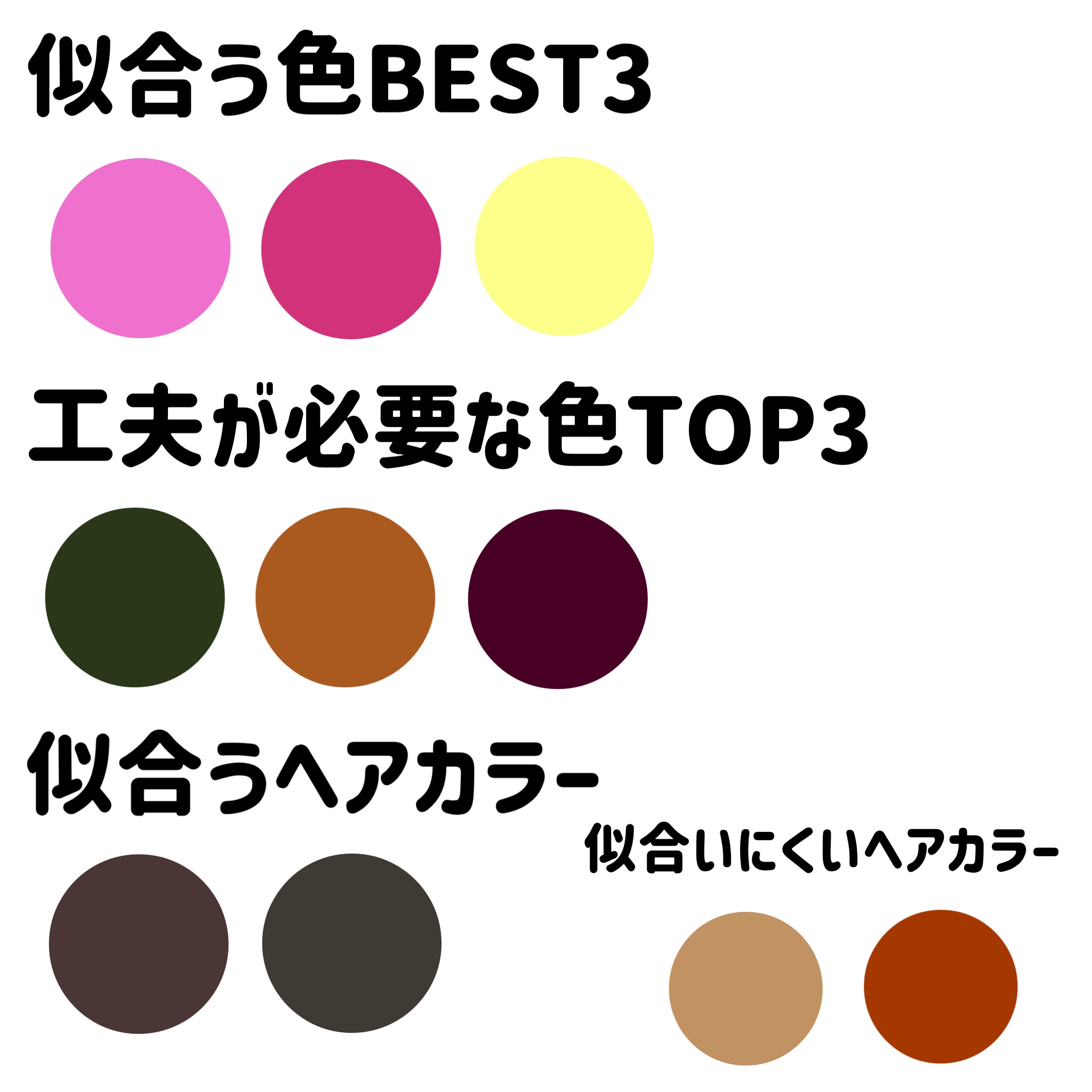 自己診断があんまりにも外れてるのでびっくりしました😂 ずっとイエベと思い込んでたので、手持ちのコスメとお洋服はほぼさよならしました(;_;)/~~ 黄みが超苦手ですぐに黄ぐすみするようで、青み強めコスメを買い漁りました🦋(確かにオレンジリップがしぬほど似合わないとは思ってた🍊) メイクはまつげ優先!チーク色味しっかり!お人形さんぽく!との事でバチバチ好みで良かったです💓