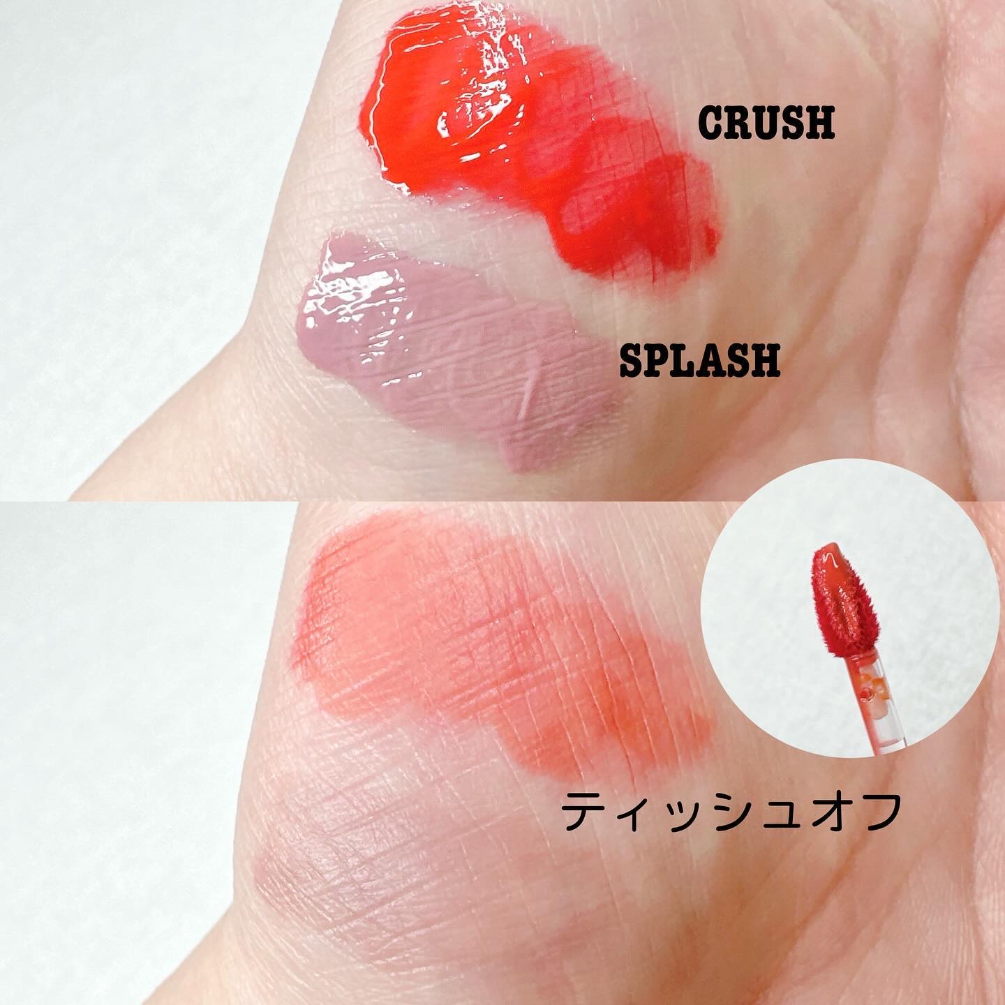 - <01 ベアピーチ(Bare Peach)> 水、ジフェニルジメチコン、ジイソステアリルマレート、ビス-ジグリセリルポリアシルアジペート-2、ビス-ベヘニル/イソステアリル/フィトステリルダイマーダイリノレイルダイマー、水素添加ポリイソブチレン、ジグリセリン、ジプロピレングリコール、セチルPEG/PPG-10/1ジメチコン、ソルビタンイソステアレート、ポリソルベート60、ペンチレングリコール、オクチルドデカノール、酸化チタン (CI 77891)、セテアレツ-20、ヒドロキシエチルアクリレート/ナトリウムアクリロイルジメチルタウレート共重合体、フェノキシエタノール、スクワラン、ステビオシド、香料、イエロー5 (CI 19140)、エチルヘキシルグリセリン、イエロー6 (CI 15985)、レッド33 (CI 17200)、水酸化アルミニウム、アンモニウムポリアクリレート、ブチレングリコール、ブルー1 (CI 42090)、ペンタエリスリチルテトラ-ジ-t-ブチルヒドロキシヒドロシンナメート <02 リッチサーモン(Rich Salmon)> 水、ジフェニルジメチコン、ジイソステアリルマレート、ビス-ジグリセリルポリアシルアジペート-2、ビス-ベヘニル/イソステアリル/フィトステリルダイマーダイリノレイルダイマー、水素添加ポリイソブチレン、ジグリセリン、ジプロピレングリコール、セチルPEG/PPG-10/1ジメチコン、ソルビタンイソステアレート、ポリソルベート60、ペンチレングリコール、オクチルドデカノール、酸化チタン (CI 77891)、セテアレツ-20、ヒドロキシエチルアクリレート/ナトリウムアクリロイルジメチルタウレート共重合体、フェノキシエタノール、スクワラン、ステビオシド、イエロー6 (CI 15985)、レッド33 (CI 17200)、香料、エチルヘキシルグリセリン、水酸化アルミニウム、アンモニウムポリアクリレート、イエロー5 (CI 19140)、ブチレングリコール、ペンタエリスリチルテトラ-ジ-t-ブチルヒドロキシヒドロシンナメート <03 ロージーローズ(Rosy Rose)> 水、ジフェニルジメチコン、ジイソステアリルマレート、ビス-ジグリセリルポリアシルアジペート-2、ビス-ベヘニル/イソステアリル/フィトステリルダイマーダイリノレイルダイマー、水素添加ポリイソブチレン、ジグリセリン、ジプロピレングリコール、セチルPEG/PPG-10/1ジメチコン、ソルビタンイソステアレート、ポリソルベート60、ペンチレングリコール、オクチルドデカノール、セテアレツ-20、酸化チタン (CI 77891)、ヒドロキシエチルアクリレート/ナトリウムアクリロイルジメチルタウレート共重合体、スクワラン、フェノキシエタノール、ステビオシド、イエロー5 (CI 19140)、レッド33 (CI 17200)、香料、エチルヘキシルグリセリン、レッド28 (CI 45410)、水酸化アルミニウム、アンモニウムポリアクリレート、ブチレングリコール、イエロー6 (CI 15985)、ブルー1 (CI 42090)、ペンタエリスリチルテトラ-ジ-t-ブチルヒドロキシヒドロシンナメート <04 クラッシュ(Crush)> 水、ジフェニルジメチコン、ジイソステアリルマレート、ビス-ジグリセリルポリアシルアジペート-2、ビス-ベヘニル/イソステアリル/フィトステリルダイマーダイリノレイルダイマー、水素添加ポリイソブチレン、ジグリセリン、セチルPEG/PPG-10/1ジメチコン、ジプロピレングリコール、ソルビタンイソステアレート、ポリソルベート60、ペンチレングリコール、オクチルドデカノール、酸化チタン (CI 77891)、セテアレツ-20、ヒドロキシエチルアクリレート/ナトリウムアクリロイルジメチルタウレート共重合体、スクワラン、フェノキシエタノール、ポリグリセリン-3、ステビオシド、香料、エチルヘキシルグリセリン、イエロー6 (CI 15985)、レッド33 (CI 17200)、レッド28 (CI 45410)、ブルー1 (CI 42090)、イエロー5 (CI 19140) <05 スプラッシュ(Splash)> 水、ジフェニルジメチコン、ジイソステアリルマレート、ビス-ジグリセリルポリアシルアジペート-2、ビス-ベヘニル/イソステアリル/フィトステリルダイマーダイリノレイルダイマー、水素添加ポリイソブチレン、ジグリセリン、セチルPEG/PPG-10/1ジメチコン、ジプロピレングリコール、ソルビタンイソステアレート、ポリソルベート60、ペンチレングリコール、オクチルドデカノール、酸化チタン (CI 77891)、セテアレツ-20、ヒドロキシエチルアクリレート/ナトリウムアクリロイルジメチルタウレート共重合体、スクワラン、フェノキシエタノール、ポリグリセリン-3、ステビオシド、香料、エチルヘキシルグリセリン、イエロー6 (CI 15985)、レッド33 (CI 17200)、イエロー5 (CI 19140)、ブルー1 (CI 42090) <06 ヌードジンジャー(Nude Ginger)> 水、ジフェニルジメチコン、ジイソステアリルマレート、ビス-ジグリセリルポリアシルアジペート-2、ビス-ベヘニル/イソステアリル/フィトステリルダイマーダイリノレイルダイマー、水素添加ポリイソブチレン、ジグリセリン、セチルPEG/PPG-10/1ジメチコン、ジプロピレングリコール、ソルビタンイソステアレート、ポリソルベート60、ペンチレングリコール、オクチルドデカノール、酸化チタン (CI 77891)、セテアレツ-20