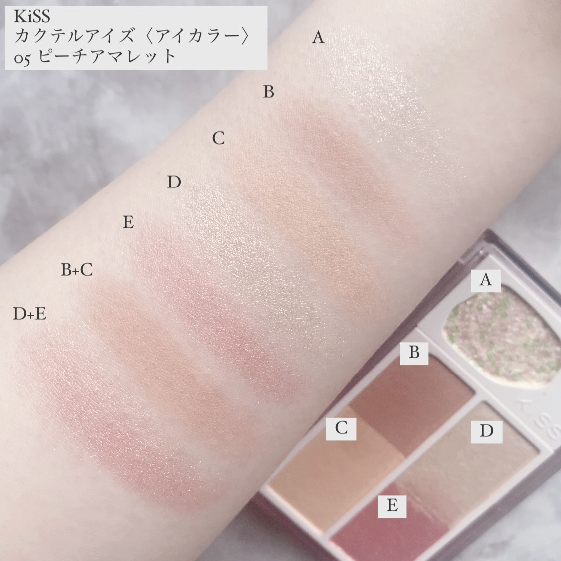 KiSSカクテルデイズ03ピンキーデライトカラーや質感を混ぜて好きな色が作れるアイパレ!左側はシマーサテンできらきらつやつやカラー、右側はシルキーマットで柔らかな発色の透け感マット。上下に仕切りがないのは色を混ぜて使うためだよ!最近アイシャド...