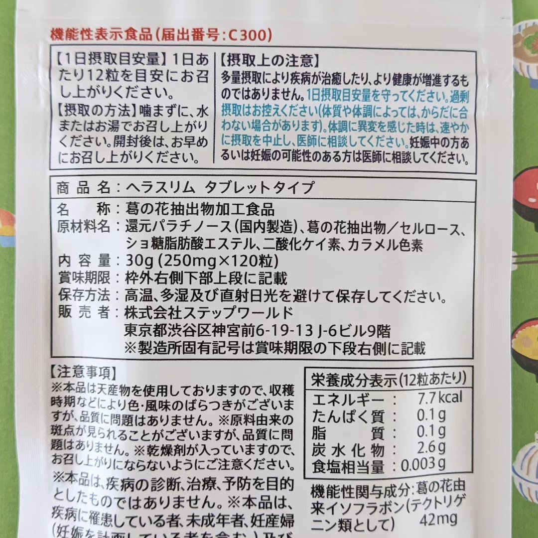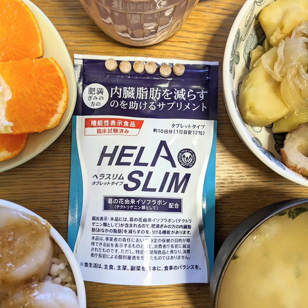 - 話題の機能性表示食品!内臓脂肪を減らすサプリメント『ヘラスリム』。 葛の花由来イソフラボン(テクトリゲニン類として)を配合した内臓脂肪を減らすのを助けるサプリメント。 葛の花由来イソフラボン(テクトリゲニン類として)には、内臓脂肪(おなかの脂肪)を減らすのを助ける機能があります。 消費者庁届出番号:C300