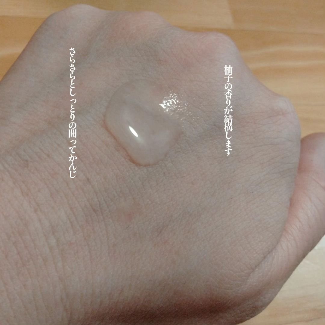 ジェルのみたいなぷるんとしたテクスチャです✨ のばすと厚みがありながらもベタつき無くつかえます😇 爽やかな柑橘系の香りがスッキリします😇💕 さっぱりしてるので、私のようにニキビ気になる方やオイリー肌さんにおすすめです😘
