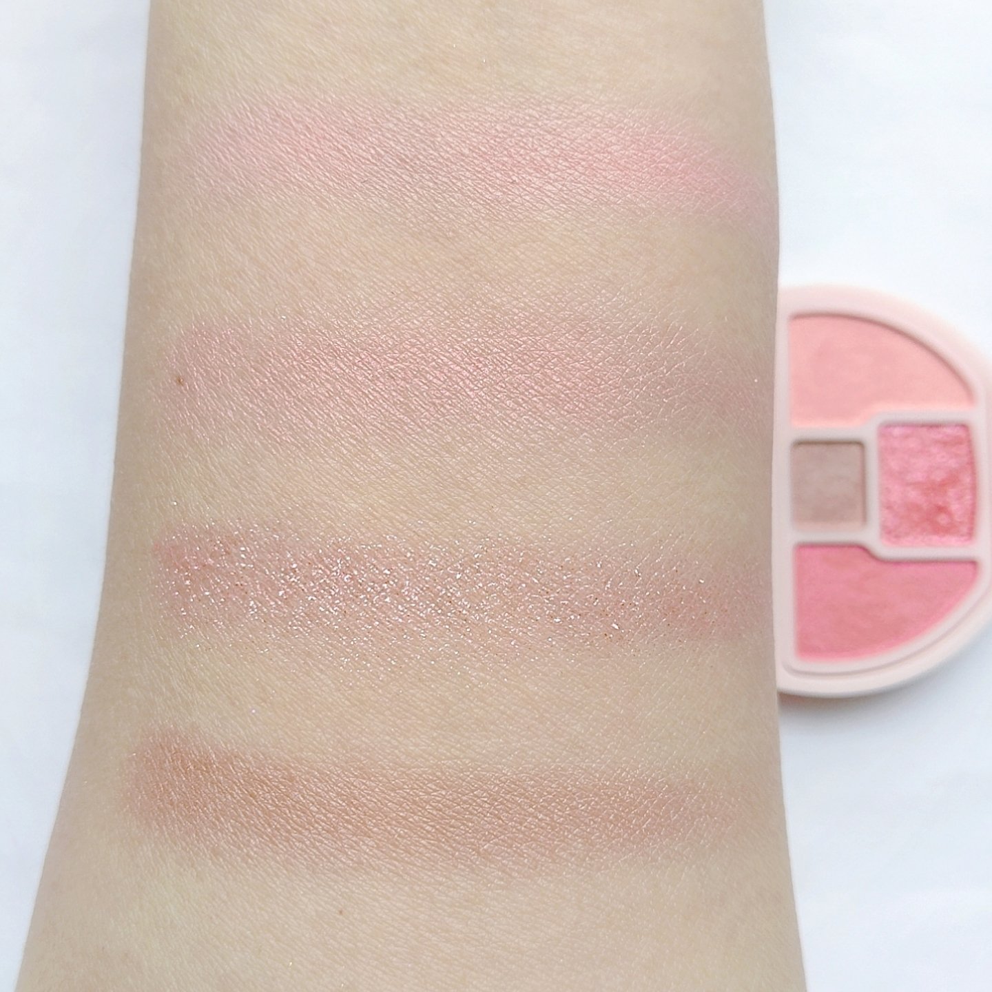 プチプラのクオリティじゃないっ!! 発売前からチェックしていたけれど、ここまで可愛いとは…😆 絶妙カラーで目もとのくすみを飛ばして*明るい印象に🩷 横割りグラデーションでメイクし、立体感をより出したかったので最後に1番左のカラーを上まぶたの真ん中と涙袋にのせています🙆 肌馴染みも良くて粉飛びも感じにくかったです💕 ブラウンの方も店頭に出てたら買おうかな💓