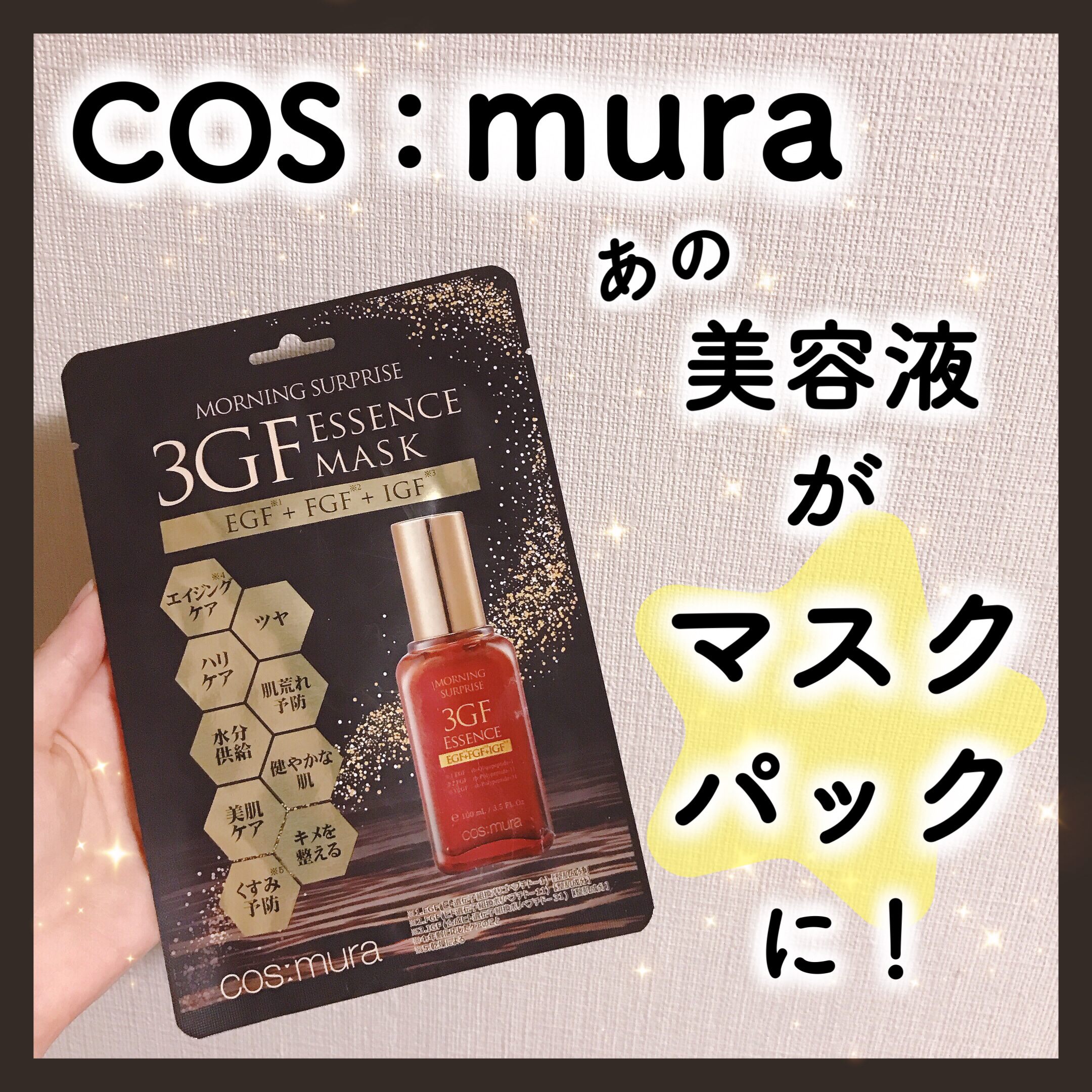 cos:mura3GFエッセンスマスク@cosmura_jpコスムラのオリジナルエッセンスがひったひたなマスクパック✨肌のコンディショニングを整える成分GF・FGF・IGFの3種成長因子がお肌にハリとツヤが✨べたつかずさっぱりとみずみずしい使...