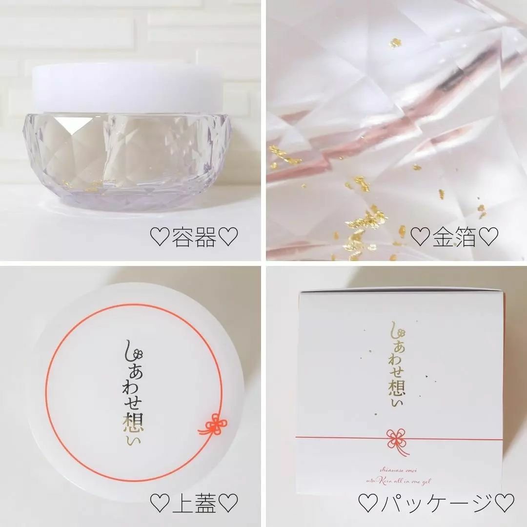 - オールインワンジェル『しあわせ想い』は、幸せのシンボルである四つ葉のクローバーから作られた成分*や、金沢産の高級金箔を配合。時短・美・幸運と、高品質スキンケア化粧品でありながら【縁起物】としての要素をプラスした、すっぴん笑顔が輝くスキンケア化粧品です。また3D形状記憶ジェル**によりお肌にハリを与え、高い弾力性を発揮。さらに独自処方成分により角質層への保湿成分の浸透力をサポートします。 *シロツメクサエキス(保湿成分) **形状を変化させても元の状態に戻るジェル