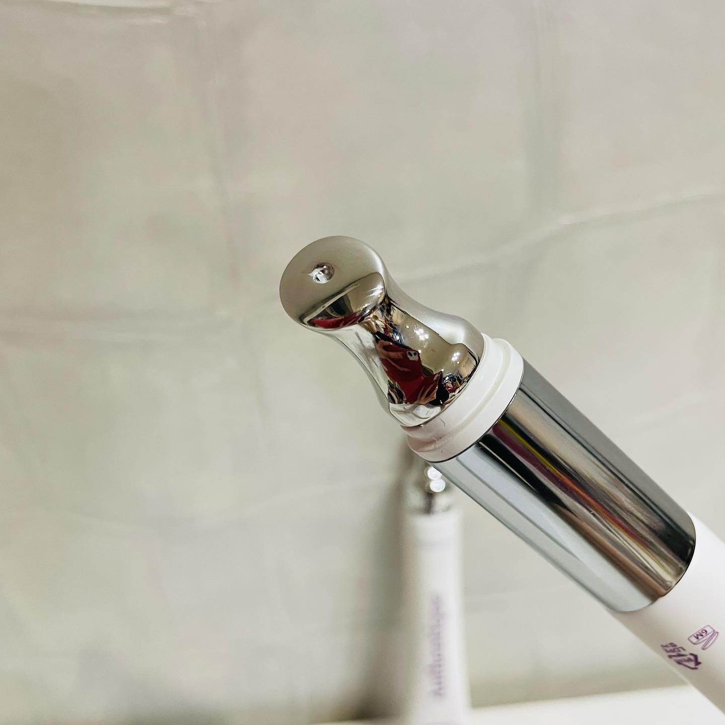 ハリやシワの改善を促す💜 ガルバニック微弱電流(Iontophoresis)+超微細振動」でマッサージ!浸透を高めるよ✨ アイクリームの蓋を取り、アプリケーターにはめるだけなので、準備は簡単。 化粧水や乳液で整えた後に使用しました。 やさしい振動も気持ちいい! 小さなヘッドなので、目の周りやほうれい線など細かいところにも、とても当てやすいです。
