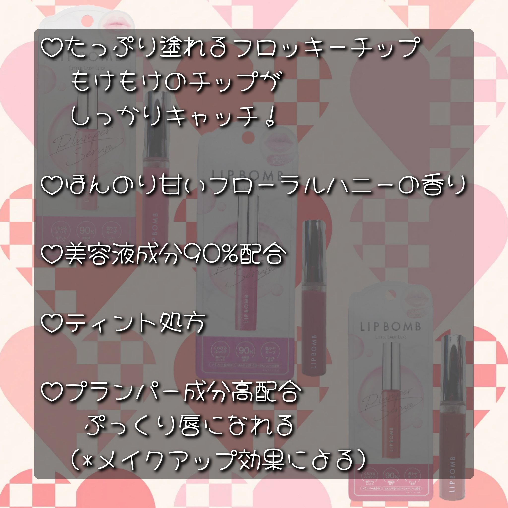 - 唇ボリュームUP※ !ぷっくり唇が叶う※、うるおいプランパーティント ※メイクアップ効果 ■美容液成分90% カサつきがちな唇もうるおってぷるんとします。 ■プランパー成分高配合(当社従来品比) スーッとしてじんわり、やみつきの使用感です。 ■色ツヤキープ 唇に定着して色持ち続くティント処方を採用。 ■1本で5役の機能 単色使いはもちろん、唇の乾燥が気になるときには美容液として、またいつものリップにプラスして 下地やグロスとしてもお使いいただけます。 ■美容液成分配合 コラーゲン、ヒアルロン酸 すべてうるおい成分 ■ほんのり甘いフローラルハニーの香り ■MADE IN JAPAN