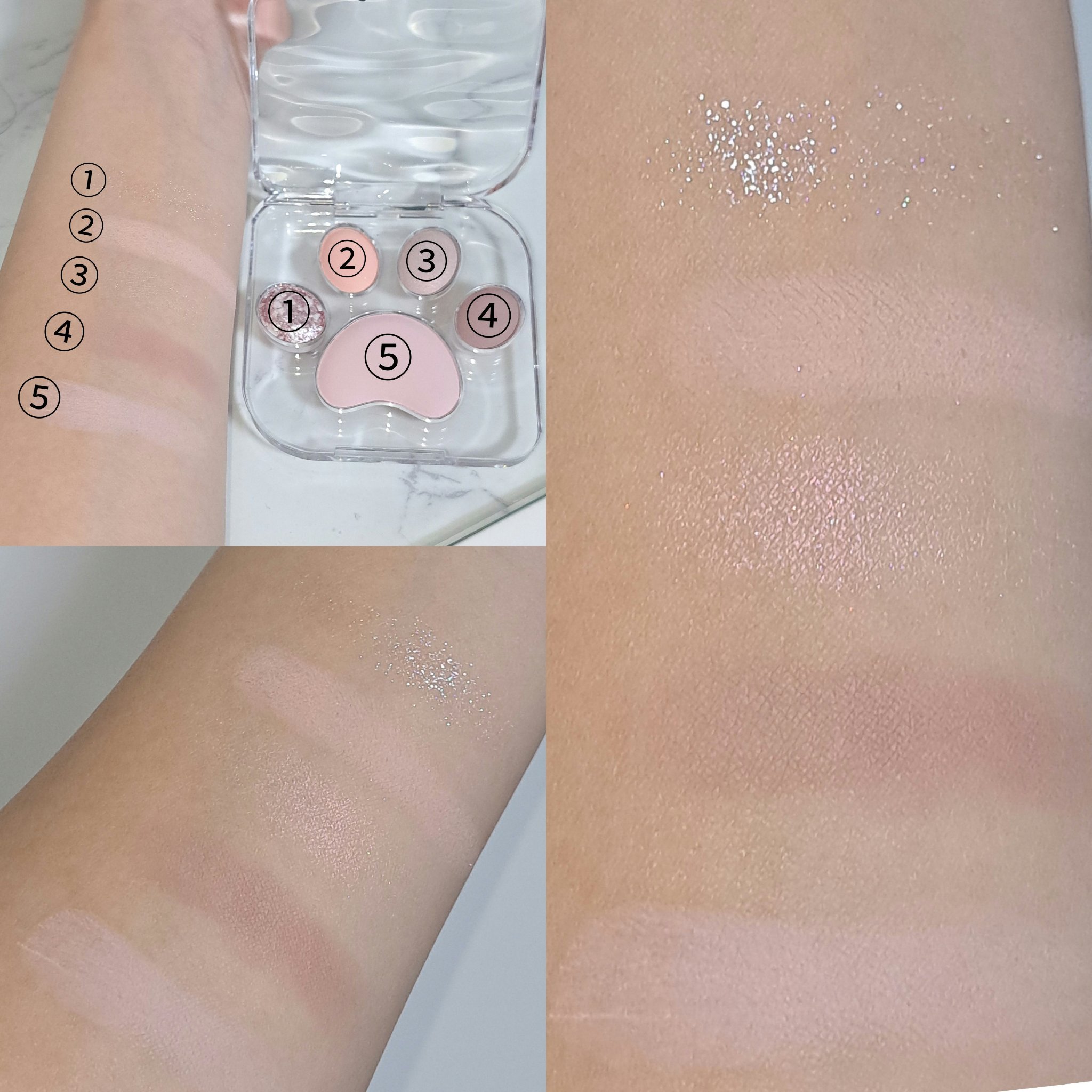 ベースカラー、締め色、ラメがそろったかわいい5色パレット💕 見た目の可愛さだけじゃなくて機能性も◎❣️ 発色が想像以上に良くて見たままのカラーでメイクできるのが楽しい♥️ 気まぐれ猫ちゃんのような女の子におすすめ🐱ฅ