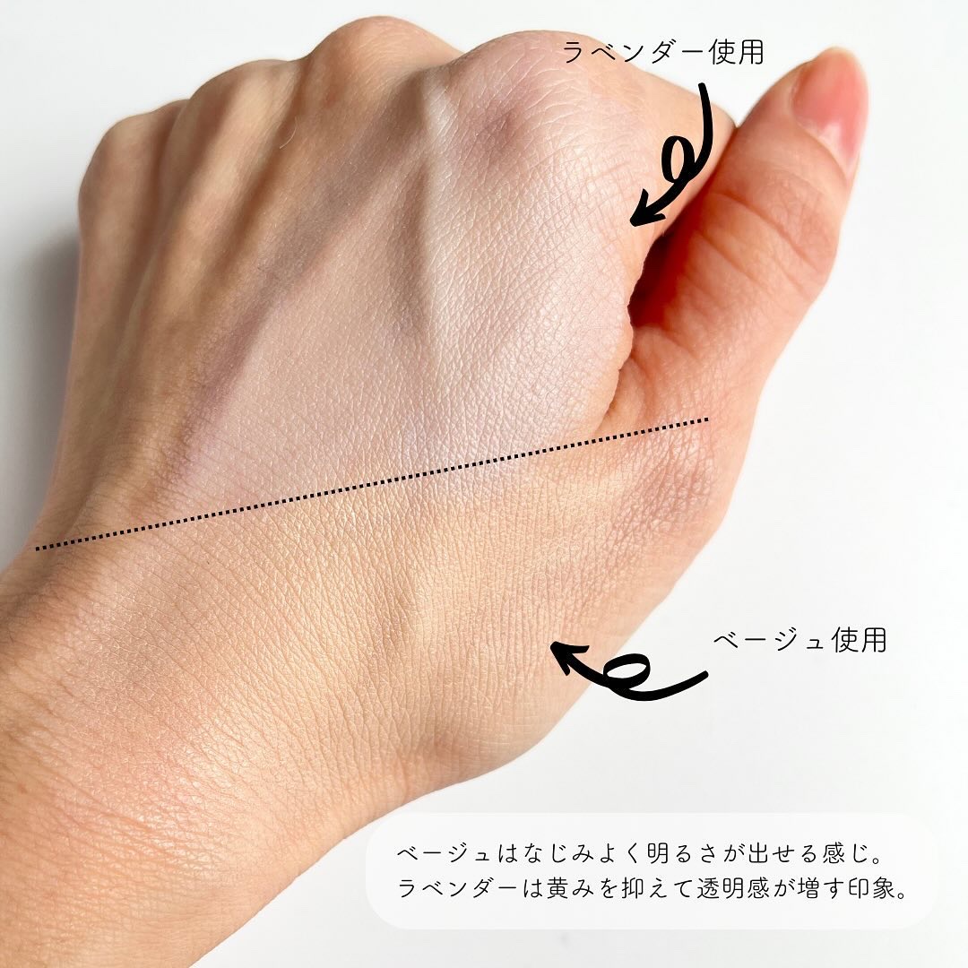 ベージュの方がなじみがよく、肌から浮く感じは皆無で自然にトーンアップできます。 すごく軽い使い心地ですが、なじみのいいカラーのおかげでより毛穴や色むらなどのアラをきれいにカバーできるように感じました。 ラベンダーは、肌の黄み感がかなり抑えられる印象! 透明感を求めるなら圧倒的にこちらで、色白に見えるように感じました。 黄みをカバーできるおかげで、苦手な青みピンクのリップやチークが似合う肌になれたので、ブルベメイクもしたいイエベさんにはラベンダーがおすすめです✨