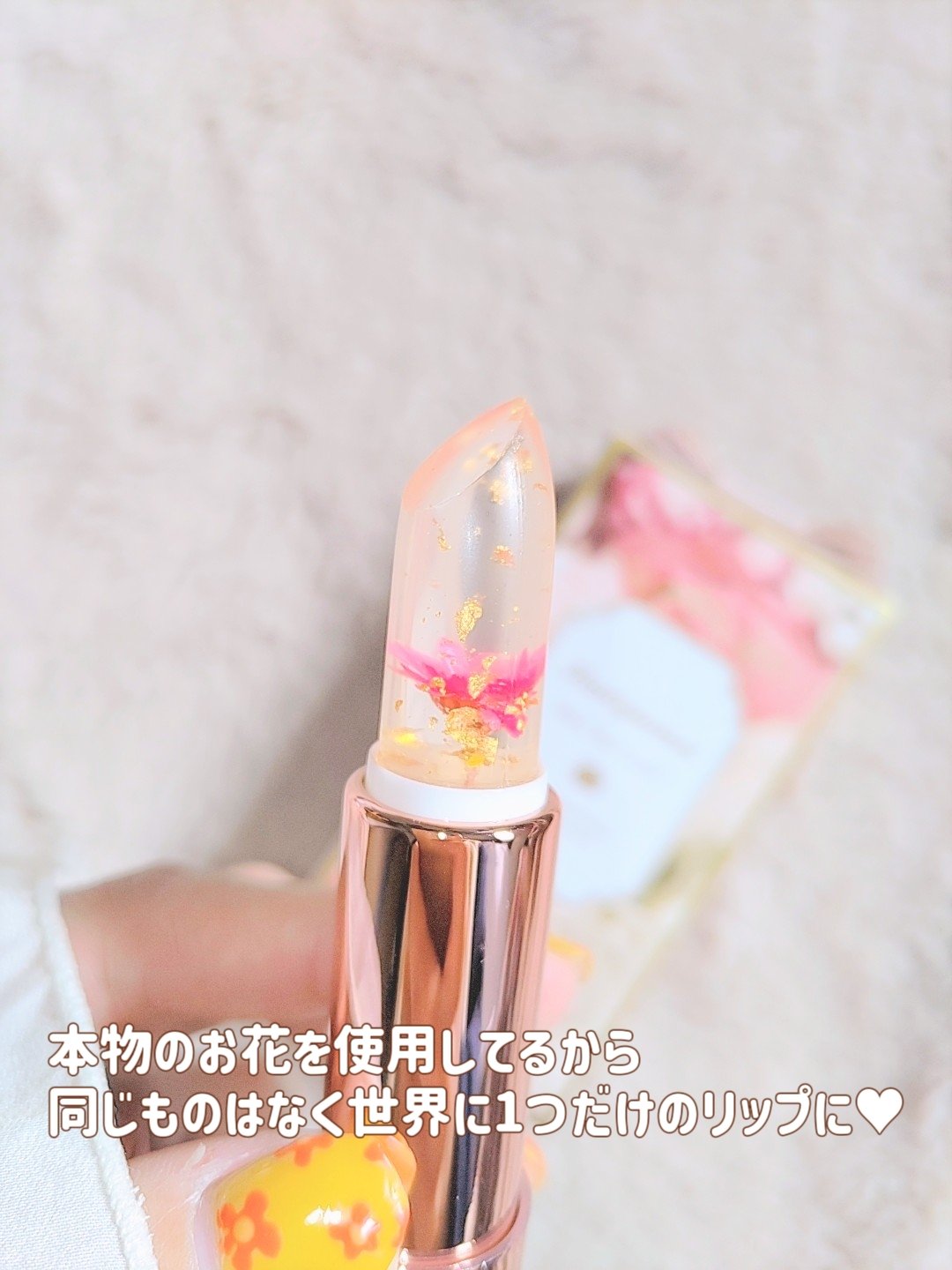 ホログラムがキラめくクリアタイプのフラワーリップ💐🌸 pHで色が変化するマジックカラーの既存品とは異なりケアに特化した色が付かないフラワーリップです🌹 本物の小さな花を手作業で閉じ込めたリップは世界に同じものが一つとしてない唯一無二のリップ💐 保湿美容液成分を豊富に配合 5種の植物由来美容オイル ◯ホホバ種子油 ◯ヒマシ油 ◯アルガンオイル ◯カメリア種子油 ◯ツバキ種子油