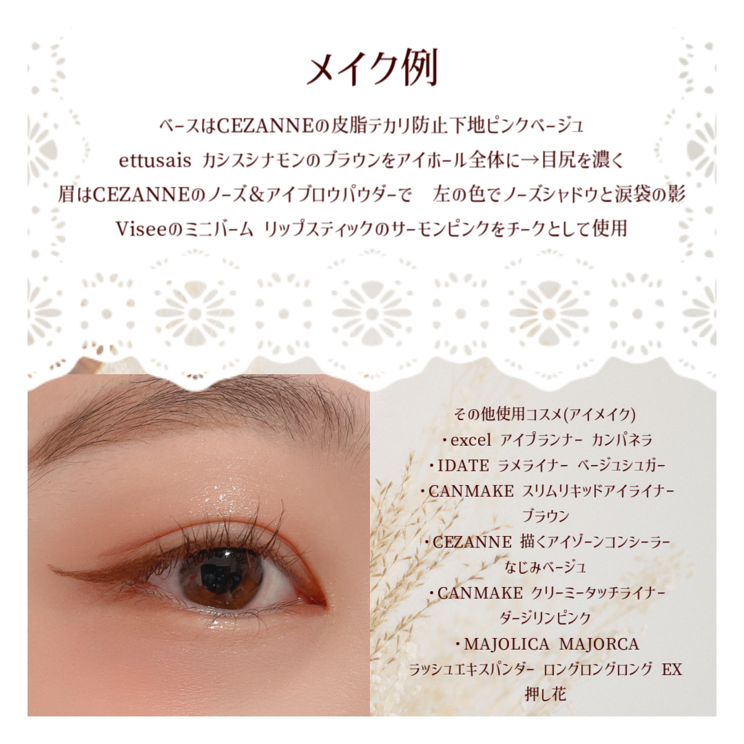 Viséeのニュアンス デューイ クリエイターは単品でもほんっっとにおすすめ✨✨ 粉質がしっとりしていて、派手過ぎず、上品なツヤのあるまぶたになって、本当に好きです。 ettusaisのエテュセ アイエディションカラーパレットも、このラメがかわいい😭 高発色というより、ふんわりと色がのるので、これも上品な雰囲気になります✨ キャンメイクのミックスアイブロウカラーは、安くて、使い心地に良い! でも、もっと安くで良いものないかなーと模索中です👀