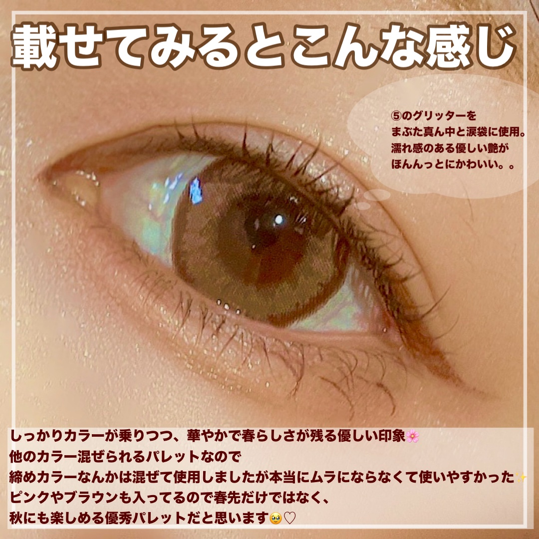 特に03.04番の新作は発売当初から大人気でいまでも店頭に並んでおらず、売り切れたら絶対買って!っていうこの商品。 01番はイエベ春さん、イエベ秋さんに特におすすめのカラーになってて、涙袋用にマット1色、艶系が2色、さらに血色影カラーの計4色が可愛らしいパレットに入ってるのが魅力的♡ なかでも、私が一目ぼれした画像②のラメカラーはとにかくつやっつやでめちゃくちゃ可愛くてお気に入り❤️🔥