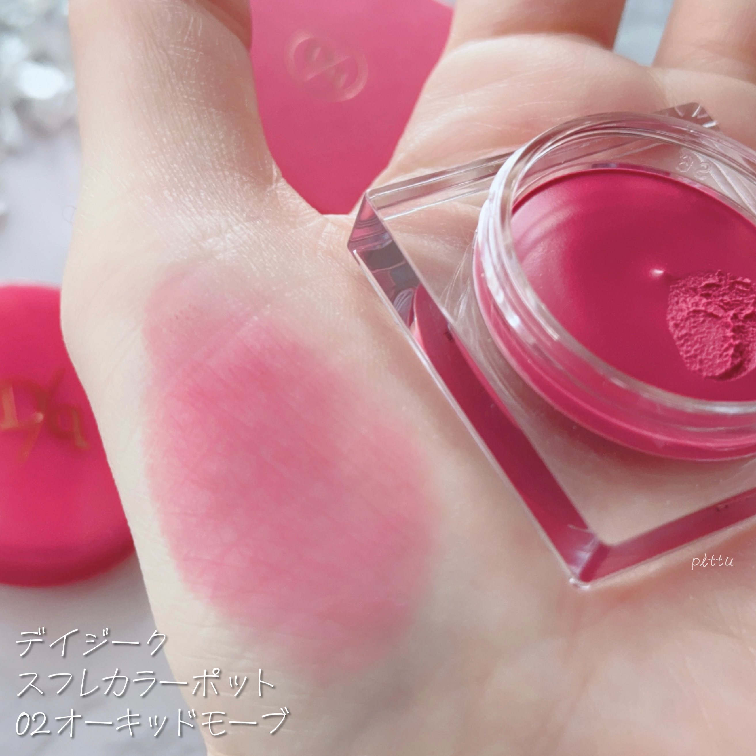 カラバリは2色展開、公式情報がないので不安ですがどうやら限定販売のようです! 01 プリュムフラワー ピンクベージュ系でまとめられたパレット 全体的にライトなピンクが多く、イエベ春の方向きに感じます 02 ボヌールマロン 赤みのあるカラーでまとめられたパレット 明るいカラーもありますがベージュや赤みブラウン等イエベ秋の方向きに感じます 表面のエンボス加工もかわいいのばっかりですね! ラメ強めが格子柄だからわかりやすいし、まとまりが良い⸜(๑⃙⃘'ᵕ'๑⃙⃘)⸝⋆* ちなみにこちらのパレットは8色も入っているのにかなりコンパクトで、1色の大きさが私の親指の爪よりちょい大きめという嬉しさ…! フタの水面のデザインは内側だけに施されているので、表面はツルッとしていますよ🌊 チップもふわふわで、多色パレット専用のサイズ感で長めなのが嬉しい♪ とにかく話題になっているこちら、可愛すぎるから在庫無くなるのお願い待って…🙏🏻💦