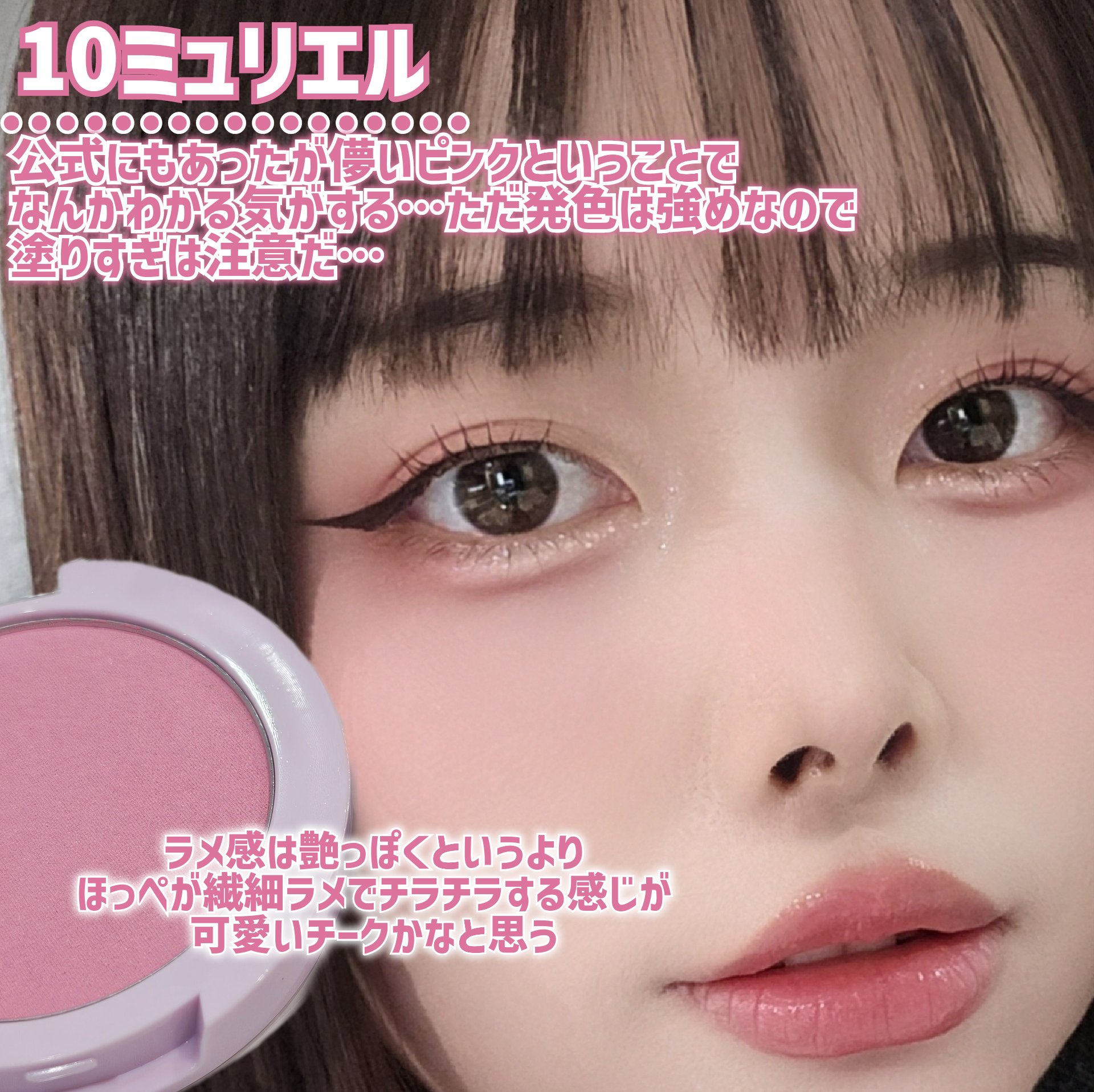 全体のローズ感と粉質もたまらなくいいんですが 左下のハイライトカラー?パールの粉が すんごい涙袋にいいんですよ… パーンとめちゃくちゃ涙袋盛れるけど、 ほんのりピンクがかった白みベージュなので 平成ギャルみたいになるわけではない…と思う ほんとこのハイライトカラーが涙袋に良すぎて いつかここだけ底見えする説…