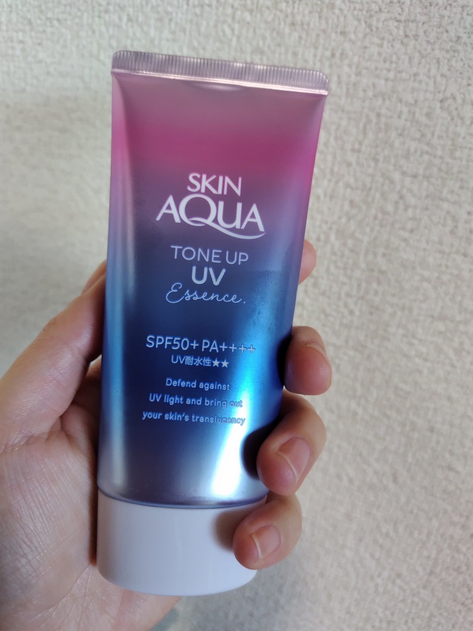 - ※カラー名称「ハピネスオーラ」は「ローズ」へ名称変更となりました。 <ミントグリーン> 赤み補正*1!UVカットしながら、色と光をコントロールし、肌をトーンアップ*1。 ミントグリーンカラーで透き通るような素肌つづく!エッセンスタイプの日焼け止め。 透明感*1のある肌に。 SPF50+、PA++++、UV耐水性★★。 鉱物油フリー。パラベンフリー。ときめくサボンの香り。 <ラベンダー> 明るさ補正*1!UVカットしながら、色と光をコントロールし、肌をトーンアップ*1。 透明感*1を引き出すラベンダーカラーの日焼け止め。 すーっとのびて、みずみずしい使い心地のエッセンスタイプ。 SPF50+、PA++++、UV耐水性★★。 鉱物油フリー。パラベンフリー。ときめくサボンの香り。 <ローズ> 血色感補正*1!UVカットしながら、色と光をコントロールし、肌をトーンアップ*1。 ローズカラーで血色をプラスし、透明感*1のある肌に。 エッセンスタイプの日焼け止め。 SPF50+、PA++++、UV耐水性★★。 パラベンフリー。ハピネスブロッサムの香り。 <ブルー> UVカットしながら、色と光をコントロールし、肌をトーンアップ*1。 血色感を抑えて儚げな色白肌*1に見せるブルーカラーの顔・からだ用日やけ止め。すーっとのびて、みずみずしい使い心地。 透明感ブルー×透明感ホワイト=はかなげブルーカラーで、自分史上最高*2の色白肌*1、うるおう美容液成分(うるおい成分)としてヒアルロン酸Na、ビタミンC誘導体*3配合。 SPF50+/PA++++。こころがときめくサボンの香り。化粧下地にも。石けんで落とせます。 パラベンフリー。鉱物油フリー。アレルギーテスト済み(全ての方にアレルギーが起こらないというわけではありません)。 *1:メイクアップ効果による *2:スキンアクアシリーズにおいて *3:リン酸アスコルビルMg(うるおい成分)