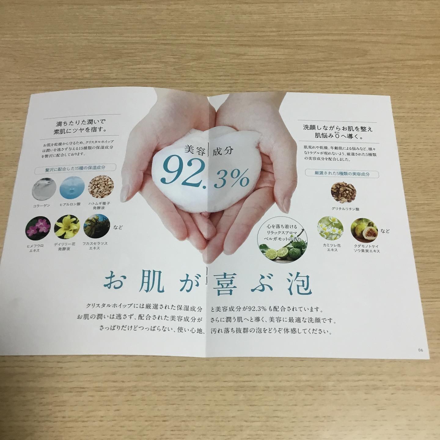 - <クリスタルホイップ> 水、グリセリン、LPG、ベヘン酸、ベヘニルアルコール、PEG−25フィトスタノール、ヒアルロン酸Na、加水分解コラーゲン、グリチルリチン酸2K、レモングラス葉/茎エキス、エーデルワイスカルス培養エキス、カミツレ花エキス、サッカロミセス/ハトムギ種子発酵液、二酸化炭素、ベルガモット果実油、フカスセラツスエキス、ラミナリアディギタータエキス、ヒメフウロエキス、クダモノトケイソウ果実エキス、サッカロミセス/デイリリー花発酵液、バチルス発酵物、2,4−ジカルボエトキシパントテン酸エチル、(メタクリル酸グリセリルアミドエチル/メタクリル酸ステアリル)コポリマー、BG、PG、パルミチン酸エチルヘキシル、TEA、メチルパラベン <120g> 水、グリセリン、LPG、ベヘン酸、ベヘニルアルコール、PEG−25フィトスタノール、ヒアルロン酸Na、加水分解コラーゲン、グリチルリチン酸2K、レモングラス葉/茎エキス、エーデルワイスカルス培養エキス、カミツレ花エキス、サッカロミセス/ハトムギ種子発酵液、二酸化炭素、ベルガモット果実油、フカスセラツスエキス、ラミナリアディギタータエキス、ヒメフウロエキス、クダモノトケイソウ果実エキス、サッカロミセス/デイリリー花発酵液、バチルス発酵物、2,4−ジカルボエトキシパントテン酸エチル、(メタクリル酸グリセリルアミドエチル/メタクリル酸ステアリル)コポリマー、BG、PG、パルミチン酸エチルヘキシル、TEA、メチルパラベン <120g(ディズニー限定デザイン)> 水、グリセリン、LPG、ベヘン酸、ベヘニルアルコール、PEG−25フィトスタノール、ヒアルロン酸Na、加水分解コラーゲン、グリチルリチン酸2K、レモングラス葉/茎エキス、エーデルワイスカルス培養エキス、カミツレ花エキス、サッカロミセス/ハトムギ種子発酵液、二酸化炭素、ベルガモット果実油、フカスセラツスエキス、ラミナリアディギタータエキス、ヒメフウロエキス、クダモノトケイソウ果実エキス、サッカロミセス/デイリリー花発酵液、バチルス発酵物、2,4−ジカルボエトキシパントテン酸エチル、(メタクリル酸グリセリルアミドエチル/メタクリル酸ステアリル)コポリマー、BG、PG、パルミチン酸エチルヘキシル、TEA、メチルパラベン <クリスタルホイップ【旧】> 水、グリセリン、LPG、ベヘン酸、ベヘニルアルコール、PEG-25フィトスタノール、二酸化炭素、ベルガモット果実油、フカスセラツスエキス、ラミナリアディギタータエキス、カミツレ花エキス、ヒメフウロエキス、クダモノトケイソウ果実エキス、サッカロミセス/デイリリー花発酵液、サッカロミセス/ハトムギ種子発酵液、ヒアルロン酸Na、バチルス発酵物、2,4-ジカルボエトキシパントテン酸エチル、加水分解コラーゲン、グリチルリチン酸2K、(メタクリル酸グリセリルアミドエチル/メタクリル酸ステアリル)コポリマー、BG、PG、パルミチン酸エチルヘキシル、TEA、メチルパラベン