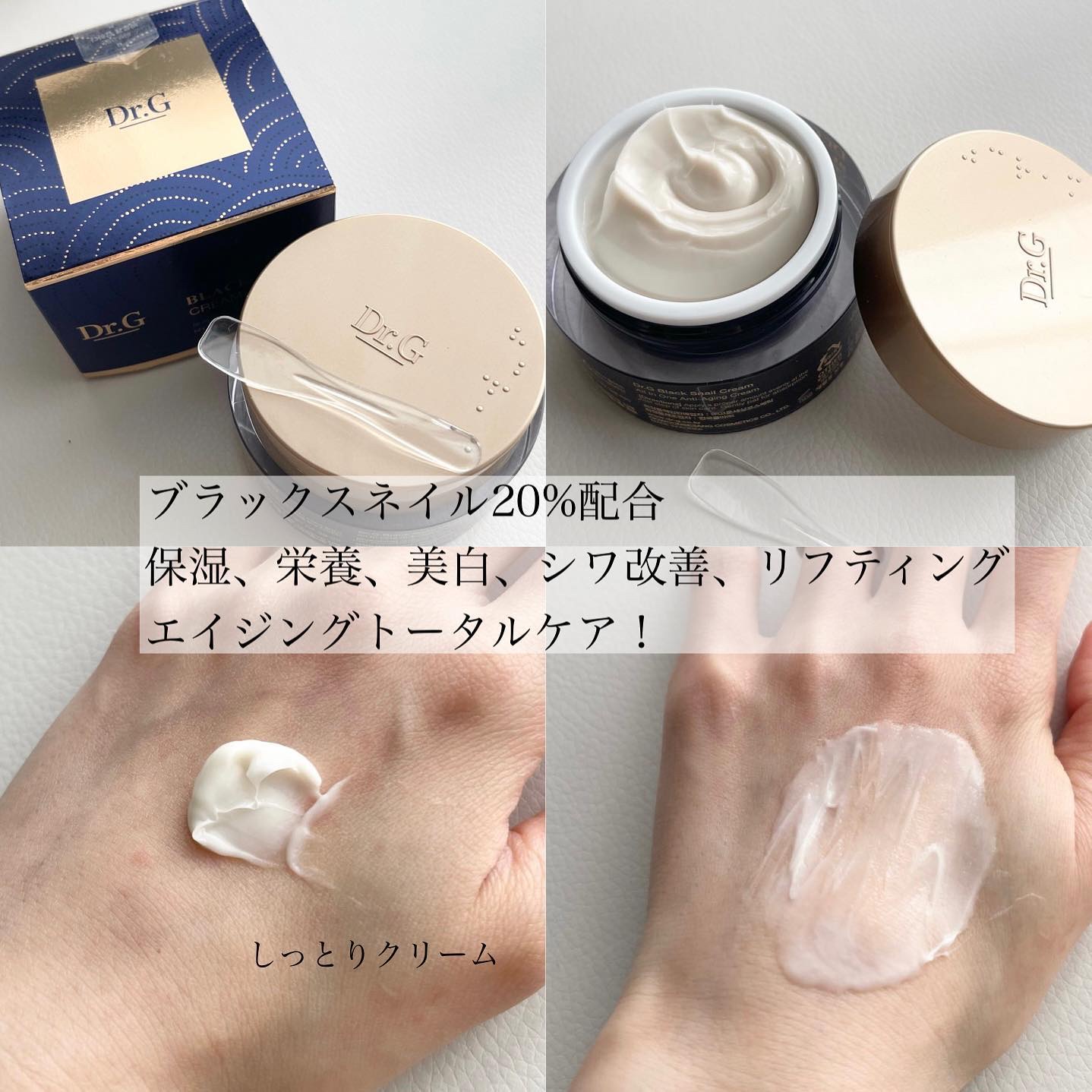 テクスチャー自体はかためなのにお肌への浸透はなめらか! ドクタージーがお肌のために考案した優れもの✨ 保湿だけでなく、美白、しわ、弾力対策にも✨ ブラックスネイルを20%&ブラックプロポリスが配合されていてアンチエイジングにぴったり🩷 ナイアシンアミドやツボクサエキスなども含まれています✨
