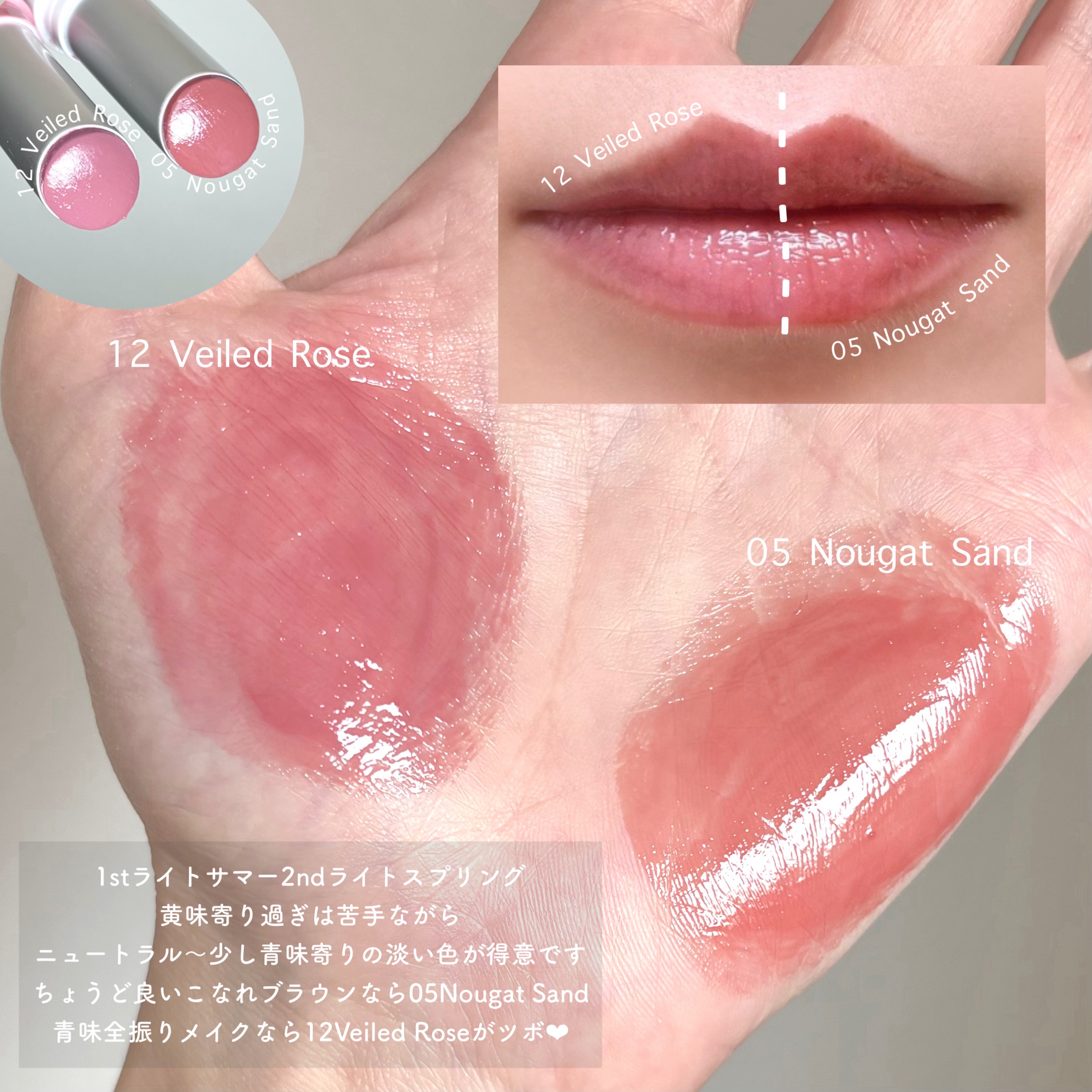 体温で柔らかくなるリップバーム。高音の場所に長時間置かないでほしいとのこと! 05 ヌガーサンドはふわっと溶けるクリームのようなヌガーブラウン 私の肌や唇だとコーラルベージュのような色に発色しました。 色・ツヤ・むりっちり感、どれも派手になりすぎず使いやすかったです🫶 バームだから乾燥しずらくて良かったけど、その分もちはよくないかな?