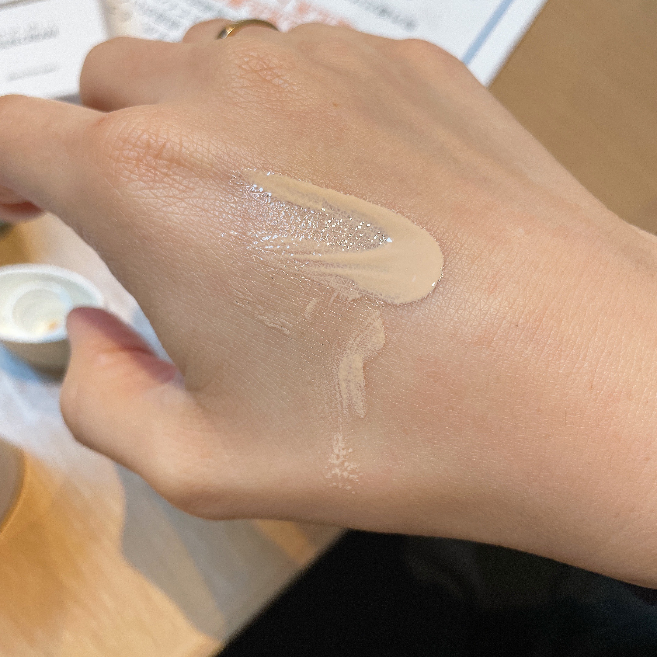 - <30mL> 酸化チタン、フェノキシエタノール、ステアリン酸、ワセリン、トレハロース、濃グリセリン、イソステアリン酸、セスキイソステアリン酸ソルビタン、トリイソステアリン酸グリセリル、クロルフェネシン、トラネキサム酸、精製水、ジプロピレングリコール、メチルポリシロキサン、トリ2-エチルヘキサン酸グリセリル、ピロ亜硫酸ナトリウム、トリエタノールアミン、1,3-ブチレングリコール、エデト酸三ナトリウム、ハマメリスエキス、L-テアニン、テトラヒドロテトラメチルシクロテトラシロキサン、テトラデセン、デカメチルテトラシロキサン、メチルフェニルポリシロキサン、無水ケイ酸、黄酸化鉄、ベンガラ、パラメトキシケイ皮酸2-エチルヘキシル、dl-α-トコフェロール、ポリプロピレングリコール、ジブチルヒドロキシトルエン、微粒子酸化チタン、ジメチルジステアリルアンモニウムヘクトライト、フェニルベンズイミダゾールスルホン酸、水酸化アルミニウム、2-[4-(ジエチルアミノ)-2-ヒドロキシベンゾイル]安息香酸ヘキシルエステル、PEG-9 ポリジメチルシロキシエチル ジメチコン、黄酸化鉄被覆雲母チタン、オクタメチルトリシロキサン