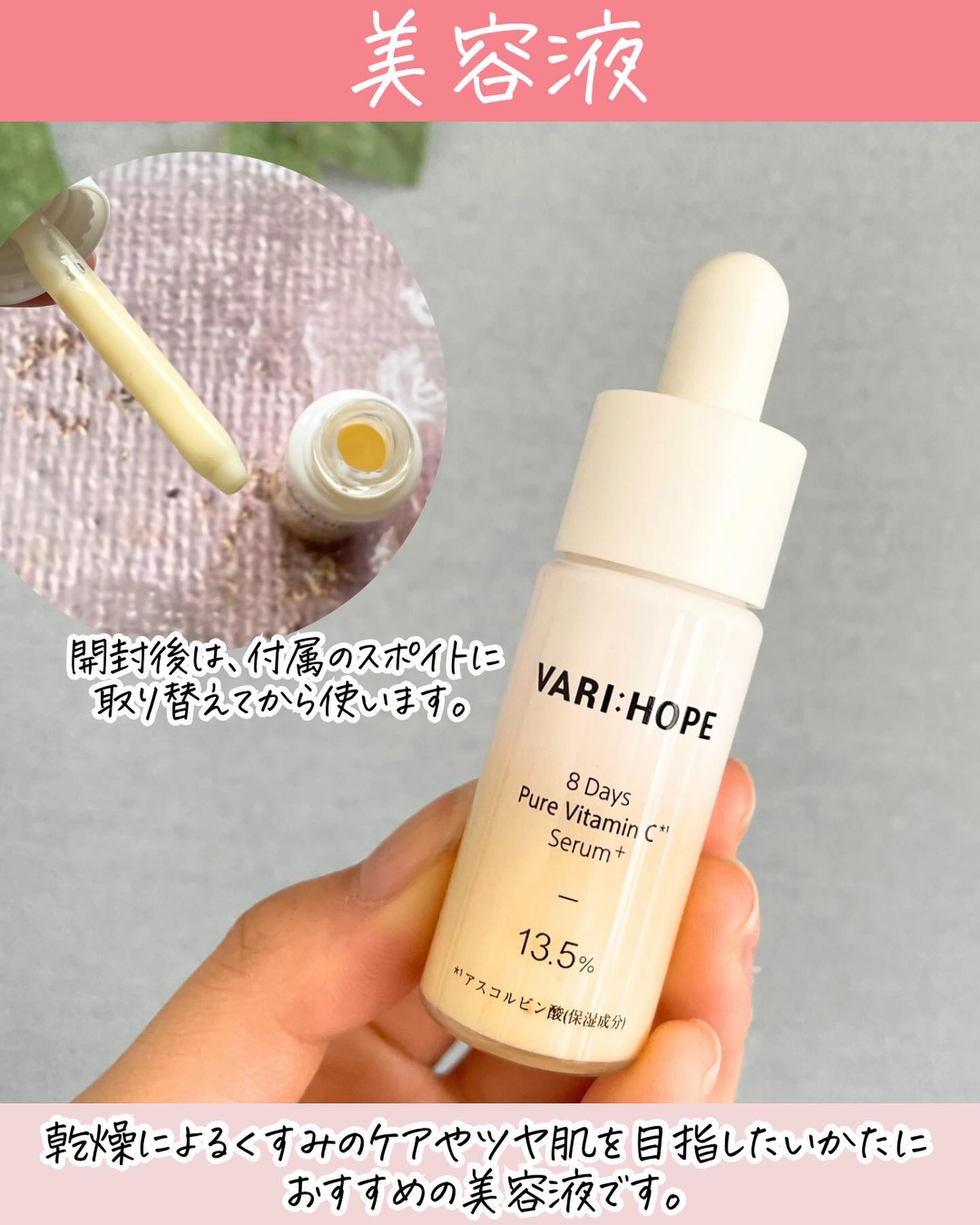 VARIHOPE(@varihope_jp )の白玉セットをお試しさせて頂きました💕 #8デイズピュアビタミンc美容液 #8デイズピュアビタミンcクリーム #8デイズピュアビタミンcマスクパック (5枚入) のセットに、ポーチ、洗顔がおまけでついてくるよ!!お得すぎる!! 水ベースのピュアビタミンC*1配合の美容液。トロッとしたテクスチャーだけど伸びも良くて浸透も早かった!!韓国で累計200万本以上累計販売のある人気美容液!! ビタミンC美容液たっぷり入ってるマスクパック! これさ、クリームの次に使用するのよ!
