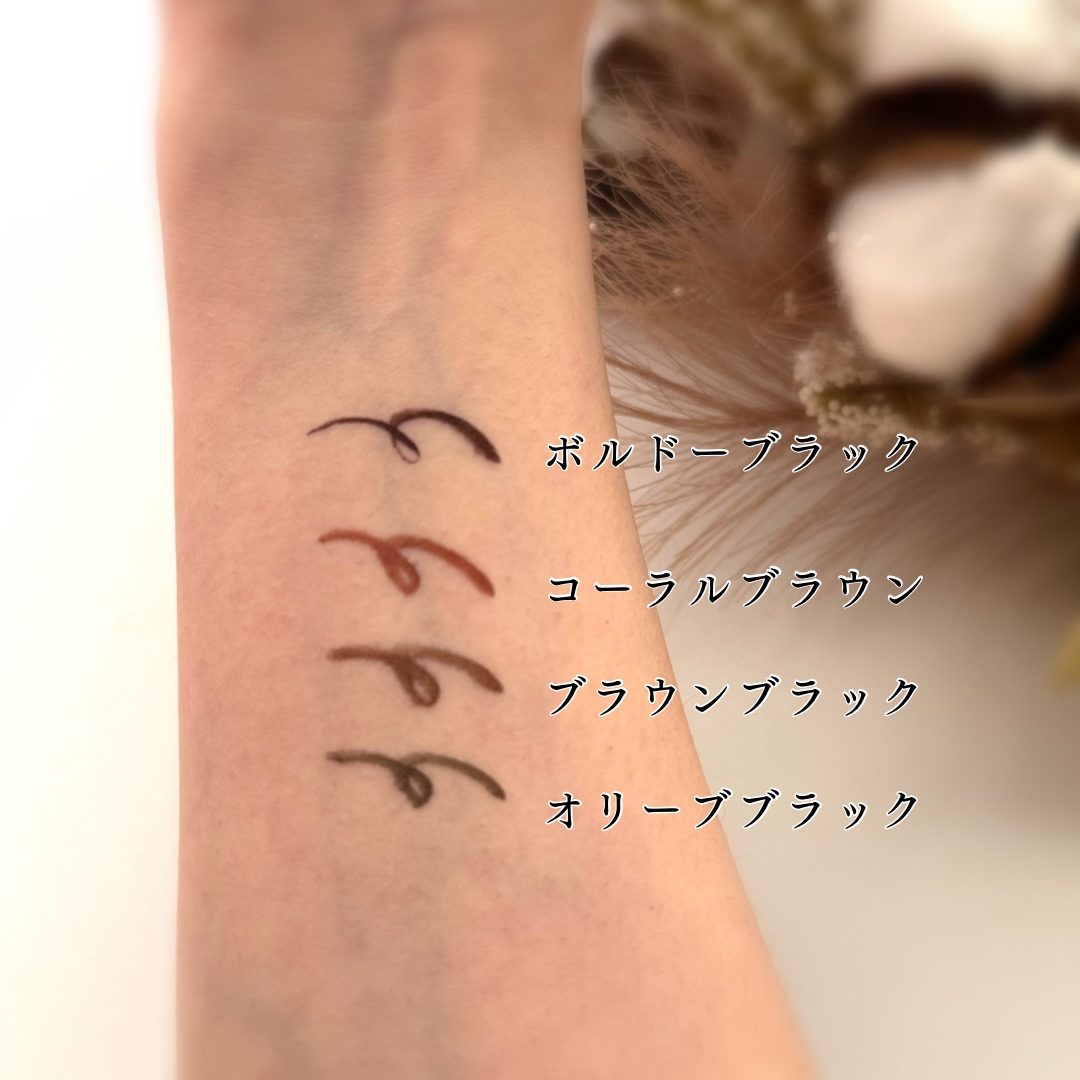 - <01 ブラウンブラック> 水、BG、(アクリル酸エチルヘキシル/メタクリル酸メチル)コポリマー、炭、シリカ、1,2-ヘキサンジオール、シルク、ヒアルロン酸Na、サクシノイルアテロコラーゲン、ポリクオタニウム-51、パンテノール、加水分解シルク、センブリエキス、センチフォリアバラ花エキス、ハイビスカス花エキス、ローマカミツレ花エキス、ラベンダー花エキス、フユボダイジュ花エキス、トウキンセンカ花エキス、ヤグルマギク花エキス、ユキノシタエキス、カミツレ花エキス、セイヨウオトギリソウ花/葉/茎エキス、ユチャ種子油、グリセリン、ペンチレングリコール、(アクリレーツ/メチルスチレン/スチレン)コポリマーアンモニウム、アクリレーツコポリマーアンモニウム、べへネスー30、ポリアスパラギン酸Na、ジラウロイルグルタミン酸リシンNa、カプリリルグリコール、エチルヘキシルグリセリン、水酸化K、EDTAー2Na、ベントナイト、トコフェロール、リン酸K、リン酸2Na、フェノキシエタノール、エタノール、メチルパラベン、酸化チタン、酸化鉄 <02 ボルドーブラック> 水、BG、(アクリル酸エチルヘキシル/メタクリル酸メチル)コポリマー、炭、1,2-ヘキサンジオール、シリカ、ペンチレングリコール、アクリレーツコポリマーアンモニウム、シルク、ヒアルロン酸Na、サクシノイルアテロコラーゲン、ポリクオタニウム-51、パンテノール、加水分解シルク、センブリエキス、センチフォリアバラ花エキス、ハイビスカス花エキス、ローマカミツレ花エキス、ラベンダー花エキス、フユボダイジュ花エキス、トウキンセンカ花エキス、ヤグルマギク花エキス、ユキノシタエキス、カミツレ花エキス、セイヨウオトギリソウ花/葉/茎エキス、ユチャ種子油、グリセリン、(アクリレーツ/メチルスチレン/スチレン)コポリマーアンモニウム、ジラウロイルグルタミン酸リシンNa、カプリリルグリコール、エチルヘキシルグリセリン、水酸化K、ベントナイト、トコフェロール、リン酸K、リン酸2Na、フェノキシエタノール、エタノール、メチルパラベン、赤226、酸化チタン <03 オリーブブラック> 水、BG、(アクリル酸エチルヘキシル/メタクリル酸メチル)コポリマー、炭、1,2-ヘキサンジオール、シリカ、ペンチレングリコール、シルク、ヒアルロン酸Na、サクシノイルアテロコラーゲン、ポリクオタニウム-51、パンテノール、加水分解シルク、センブリエキス、センチフォリアバラ花エキス、ハイビスカス花エキス、ローマカミツレ花エキス、ラベンダー花エキス、フユボダイジュ花エキス、トウキンセンカ花エキス、ヤグルマギク花エキス、ユキノシタエキス、カミツレ花エキス、セイヨウオトギリソウ花/葉/茎エキス、ユチャ種子油、グリセリン、(アクリレーツ/メチルスチレン/スチレン)コポリマーアンモニウム、べへネスー25、アクリレーツコポリマーアンモニウム、ポリアスパラギン酸Na、ジラウロイルグルタミン酸リシンNa、カプリリルグリコール、エチルヘキシルグリセリン、水酸化K、ベントナイト、EDTAー2Na、トコフェロール、リン酸K、リン酸2Na、フェノキシエタノール、エタノール、メチルパラベン、酸化チタン、酸化鉄
