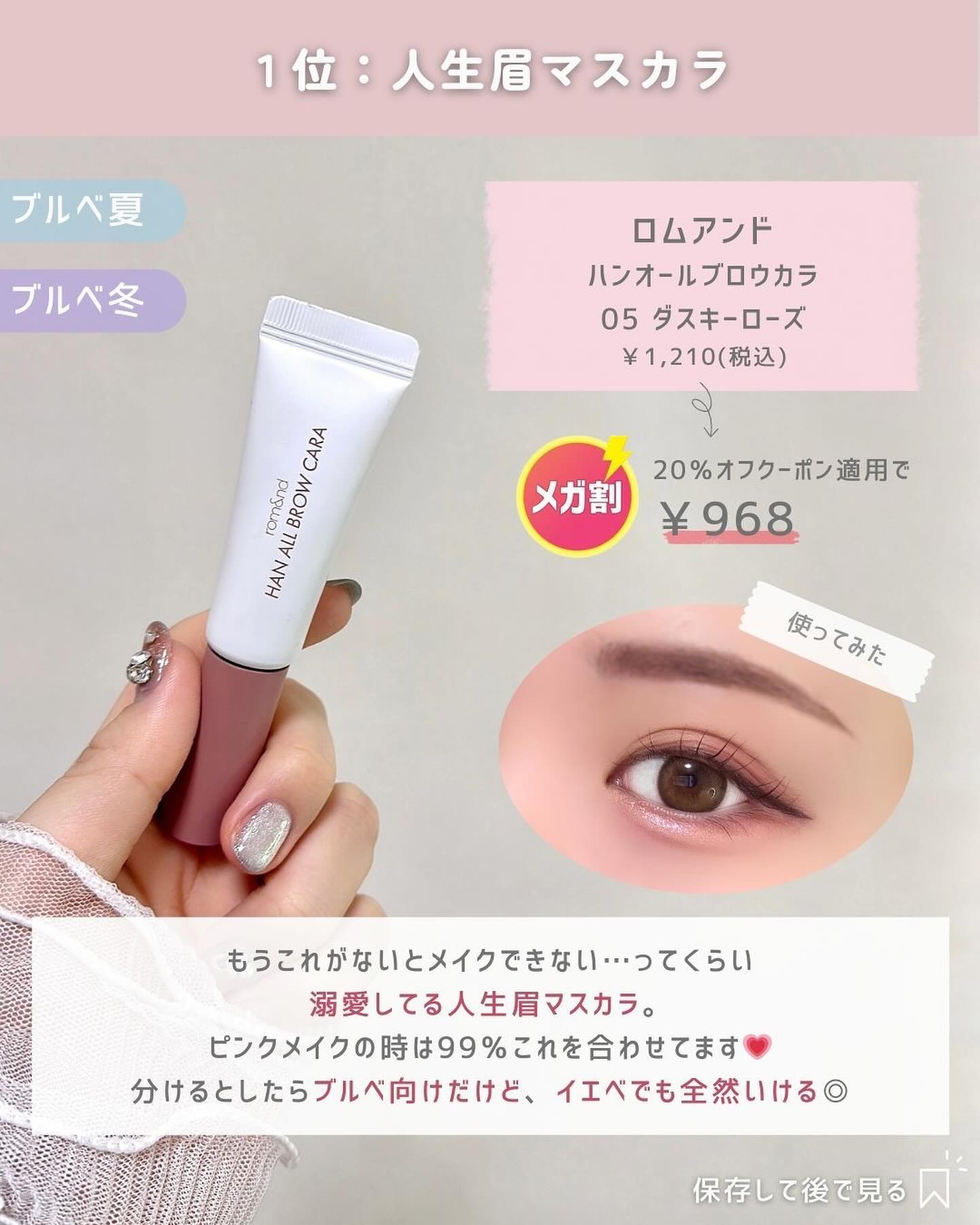 やっぱりrom&nd、優秀すぎるし、可愛すぎるよねっ💕🍨🌷 rom&nd.私も大好きだよ! ハンオールブロウカラ、初めて見た!!凄✨ リキッドグリッター、まだゲット出来てないの、、 900円でお釣りが返ってくるの??!! お得すぎる、、さすがメガ割!! めっちゃ参考になったよぉー!💕