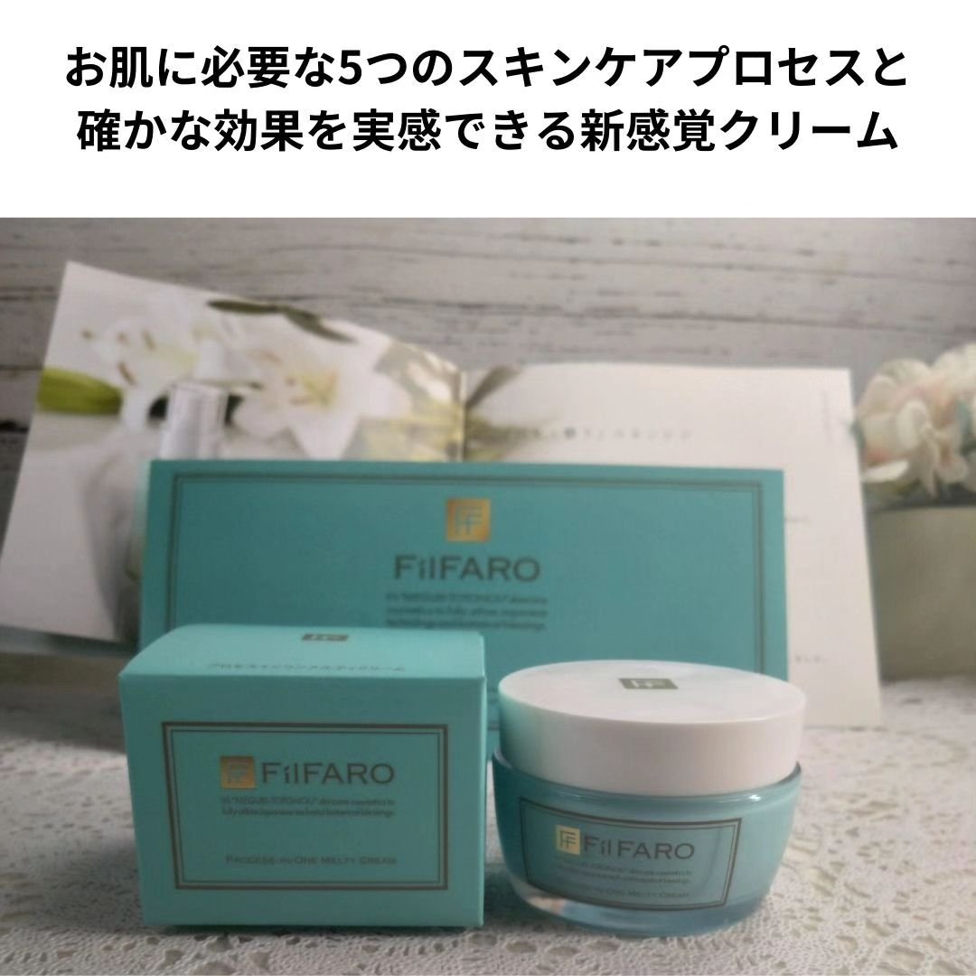 洗顔後のお肌を瞬時に整える【ファーストショットメルティセラム】(美容液)と、 お肌に必要な5つのスキンケアプロセス(クリーム、乳液、化粧水、美容液、オイル)と確かな効果を実感できる新感覚クリーム「FilFAROこだわりのオールインワンでは無い「プロセスインワン」。 お肌に優しい無添加処方パラベン、鉱物油、合成着色剤、紫外線吸収剤、合成香料、アルコール、石油系界面活性剤