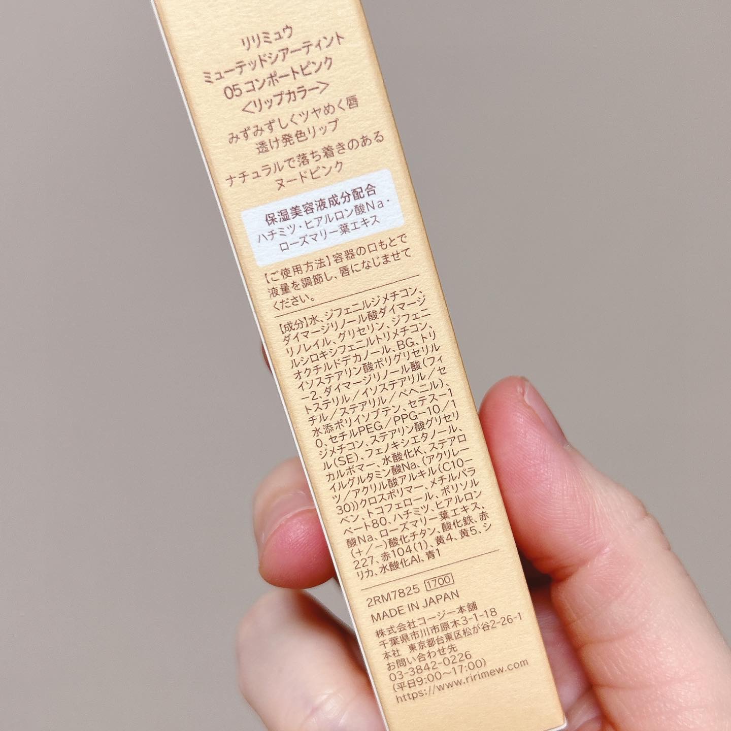 - <01 パピーレッド> 水、ダイマージリノール酸ダイマージリノレイル、ジフェニルジメチコン、ジフェニルシロキシフェニルトリメチコン、オクチルドデカノール、トリイソステアリン酸ポリグリセリルー2、ラウロイルグルタミン酸ジ(フィトステリル/オクチルドデシル)、ダイマージリノール酸(フィトステリル/イソステアリル/セチル/ステアリル/ベヘニル)、BG、水添ポリイソブテン、グリセリン、セテスー10、エタノール、セチルPEG/PPGー10/1ジメチコン、(アクリル酸ヒドロキシエチル/アクリロイルジメチルタウリンNa)コポリマー、イソヘキサデカン、フェノキシエタノール、メチルパラベン、ポリソルベート60、トコフェロール、エチルパラベン、デヒドロ酢酸Na、リン酸2Na、リン酸Na、シメチコン、シリカ、ハチミツ、スクワラン、ステアリン酸ソルビタン、ステアリン酸グリセリル、オレイン酸ポリグリセリルー10、セルロースガム、ヒアルロン酸Na、ローズマリー葉エキス、(+/ー)酸化鉄、酸化チタン、赤227、黄4、赤226、ポリアスパラギン酸Na、PVP、アクリレーツコポリマーアンモニウム、キサンタンガム、水酸化Al、EDTAー2Na <02 ピンクフォンデュ> 水、ダイマージリノール酸ダイマージリノレイル、ジフェニルジメチコン、ジフェニルシロキシフェニルトリメチコン、オクチルドデカノール、トリイソステアリン酸ポリグリセリルー2、ラウロイルグルタミン酸ジ(フィトステリル/オクチルドデシル)、ダイマージリノール酸(フィトステリル/イソステアリル/セチル/ステアリル/ベヘニル)、BG、水添ポリイソブテン、グリセリン、セテスー10、エタノール、セチルPEG/PPGー10/1ジメチコン、(アクリル酸ヒドロキシエチル/アクリロイルジメチルタウリンNa)コポリマー、イソヘキサデカン、フェノキシエタノール、メチルパラベン、ポリソルベート60、トコフェロール、エチルパラベン、デヒドロ酢酸Na、リン酸2Na、リン酸Na、シメチコン、シリカ、ハチミツ、スクワラン、ステアリン酸ソルビタン、ステアリン酸グリセリル、オレイン酸ポリグリセリルー10、セルロースガム、ヒアルロン酸Na、ローズマリー葉エキス、(+/ー)酸化鉄、酸化チタン、赤227、黄4、赤226、ポリアスパラギン酸Na、PVP、アクリレーツコポリマーアンモニウム、キサンタンガム、水酸化Al、EDTAー2Na <03 リッチグァバティー> 水、ダイマージリノール酸ダイマージリノレイル、ジフェニルジメチコン、グリセリン、ジフェニルシロキシフェニルトリメチコン、オクチルドデカノール、BG、トリイソステアリン酸ポリグリセリル-2、ダイマージリノール酸(フィトステリル/イソステアリル/セチル/ステアリル/ベヘニル)、セチルPEG/PPG-10/1ジメチコン、セテス-10、水添ポリイソブテン、ステアリン酸グリセリル(SE)、フェノキシエタノール、カルボマー、水酸化K、ステアロイルグルタミン酸Na、メチルパラベン、(アクリレーツ/アクリル酸アルキル(C10-30))クロスポリマー、トコフェロール、ポリソルベート80、ハチミツ、ヒアルロン酸Na、ローズマリー葉エキス、酸化チタン、酸化鉄、赤227、黄4、黄5、シリカ、水酸化Al、赤104(1)、青1 <04 オレンジアールグレイ> 水、ダイマージリノール酸ダイマージリノレイル、ジフェニルジメチコン、グリセリン、ジフェニルシロキシフェニルトリメチコン、オクチルドデカノール、BG、トリイソステアリン酸ポリグリセリル-2、ダイマージリノール酸(フィトステリル/イソステアリル/セチル/ステアリル/ベヘニル)、セチルPEG/PPG-10/1ジメチコン、セテス-10、水添ポリイソブテン、ステアリン酸グリセリル(SE)、フェノキシエタノール、カルボマー、水酸化K、ステアロイルグルタミン酸Na、メチルパラベン、(アクリレーツ/アクリル酸アルキル(C10-30))クロスポリマー、トコフェロール、ハチミツ、ヒアルロン酸Na、ローズマリー葉エキス、酸化鉄、黄4、赤227、黄5、シリカ <05 コンポートピンク> 水、ジフェニルジメチコン、ダイマージリノール酸ダイマージリノレイル、グリセリン、ジフェニルシロキシフェニルトリメチコン、オクチルドデカノール、BG、トリイソステアリン酸ポリグリセリル-2、ダイマージリノール酸(フィトステリル/イソステアリル/セチル/ステアリル/ベヘニル)、水添ポリイソブテン、セテス-10、セチルPEG/PPG-10/1ジメチコン、ステアリン酸グリセリル(SE)、フェノキシエタノール、カルボマー、水酸化K、ステアロイルグルタミン酸Na、(アクリレーツ/アクリル酸アルキル(C10-30))クロスポリマー、メチルパラベン、トコフェロール、ポリソルベート80、ハチミツ、ヒアルロン酸Na、ローズマリー葉エキス、(+/-)酸化チタン、酸化鉄、赤227、赤104(1)、黄4、黄5、シリカ、水酸化Al、青1 <06 ピンクマーガレット> 水、ジフェニルジメチコン、ダイマージリノール酸ダイマージリノレイル、グリセリン、ジフェニルシロキシフェニルトリメチコン、オクチルドデカノール、BG、トリイソステアリン酸ポリグリセリル-2、ダイマージリノール酸(フィトステリル/イソス