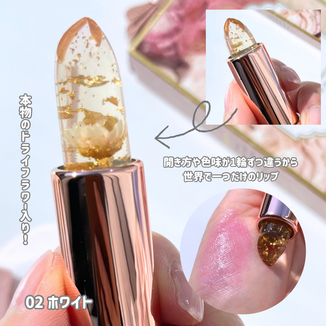 - お花の開き方、色味が一輪、一輪異なる本物のドライフラワーと金箔を中に閉じ込めた、一本一本異なる、個性がある、同じリップは一つとない、あなただけのたった一つのフラワーリップです。 唇のpH(酸性・アルカリ性)によって色が変わるマジックカラーリップです。リップは透明ですが、水分、体温、pHに反応して、唇の色があなただけの色に染まります。 食べても飲んでも落ちにくいティントリップです。従来の「塗る」リップと比べて、「染まる」ティントリップは塗っている感じではない、自然な塗り心地と発色が特徴です。