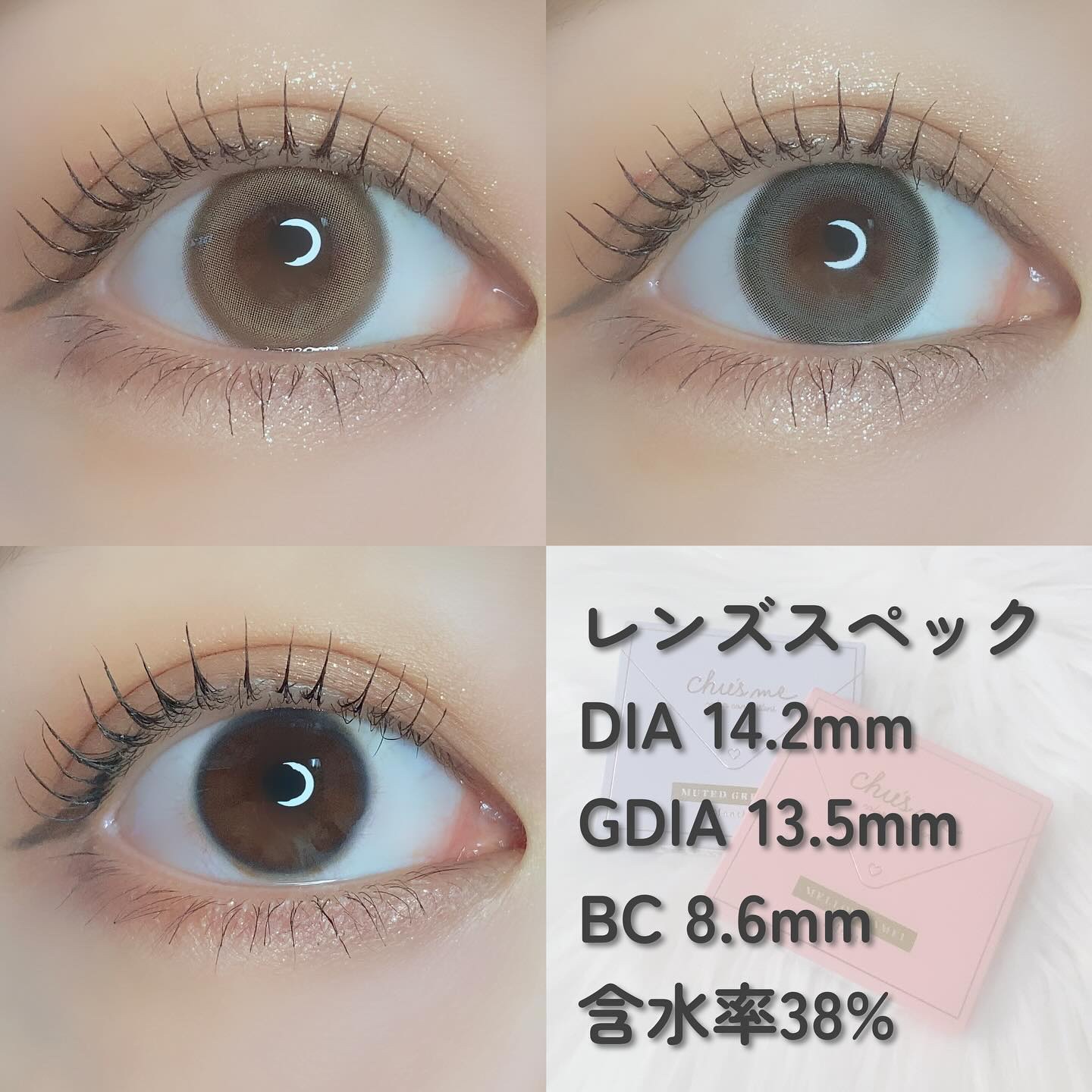 チューズミーのマンスリー限定カラーで、今年の2月に発売された2色をレポしていきます♡ᵎᵎᵎ 明るめのキャメルカラーをベースに、絶妙な太さのフチで瞳を強調しつつちゅるんとした瞳に仕上げてくれるカラコンです🫶🏻ˊ˗ 透明感たっぷりなくすみグレージュをベースとしたカラーになっています♡
