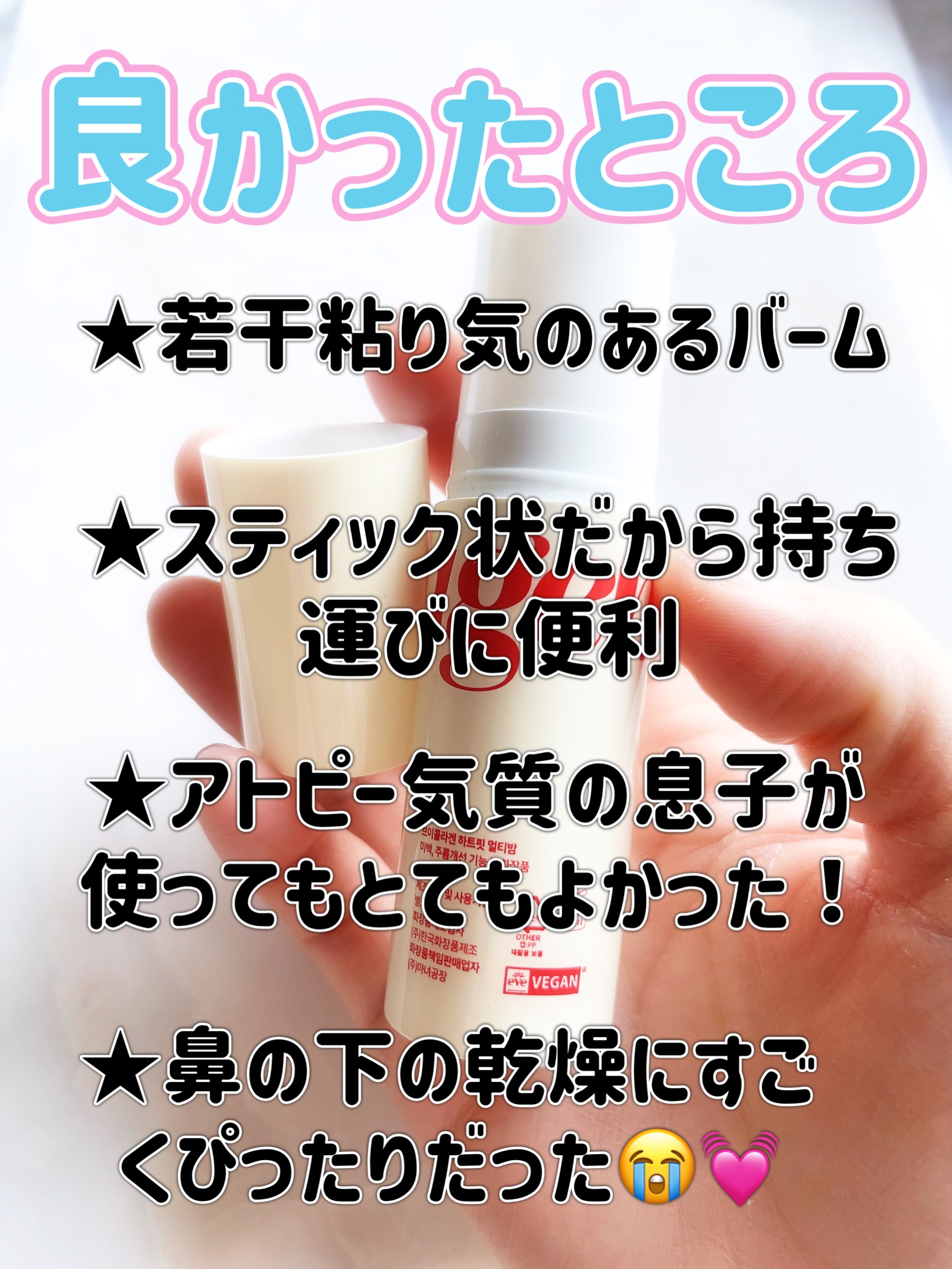 肌がパリッパリに乾燥しててもしっかり膜ができて保湿されてる感じ ベタつきが残るのでメイクの上からは使いたくないかも 魔女工場ハートフィットシリーズの乳液、クリーム共にサンプル使ったけどもっちり潤う系で、このバームもその要素が強いので、出先でも使えるスキンケアって感じがした 乾燥が酷くて耐えられない時か、出先でメイク落とす予定があってスキンケア手元にあるといい、みたいなシチュエーションなら使うかも メイクの上から保湿したいならダルバのミストが正直おすすめ、スティック型バームで探してるならネイリパの方がすき