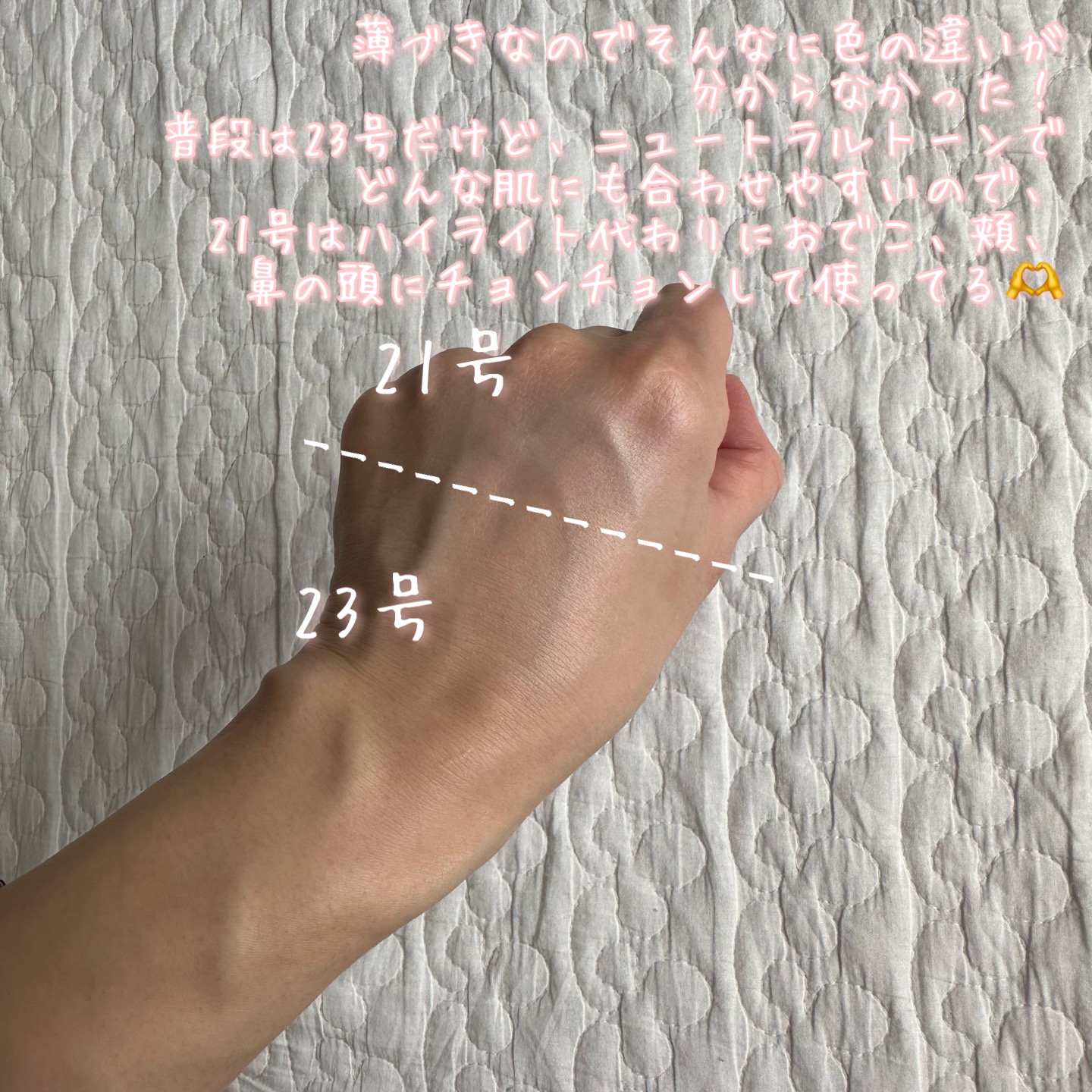 - <21号> 精製水、アジピン酸ジブチル、酸化チタン、プロパンジオール、サリチル酸エチルヘキシル、ホモサレート、エチルヘキシルトリアゾン、変性アルコール、サリチル酸ブチルオクチル、ナイアシンアミド、ジエチルアミノヒドロキシベンゾイル安息香酸ヘキシル、(カプリル/カプリン酸)ヤシアルキル、1,2-ヘキサンジオール、トリ(カプリル酸/カプリン酸)グリセリル、パンテノール、カミメボウキ葉エキス、ノウゼンハレン花/葉/茎エキス、ポリヒドロキシステアリン酸、ペンチレングリコール、イソノナン酸イソノニル、(ジグリコール/CHDM/イソフタル酸/SIP)コポリマー、シリカ、BG、ベヘニルアルコール、(アクリロイルジメチルタウリンアンモニウム/VP)コポリマー、(PEG-240/デシルテトラデセス-20/HDI)コポリマー、トリエトキシカプリリルシラン、水酸化Al、(アクリル酸Na/アクリロイルジメチルタウリン)コポリマー、ポリアクリレートクロスポリマー-6、ステアロキシヒドロキシプロピルメチルセルロース、ポリイソブテン、ステアロイルグルタミン酸Na、エチルヘキシルグリセリン、アルミナ、ステアリン酸、アデノシン、オレイン酸ソルビタン、(カプリリル/カプリル)グルコシド、セラミドNP、ポリグリセリル-3ポリジメチルシロキシエチルジメチコン、(サフラワー油/パーム油)アミノプロパンジオールエステルズ、コレステロール、トコフェロール、ラウリン酸K、ダイズステロール、リノール酸、リン脂質、カプリリルグリコール、酸化鉄 <23号> 精製水、アジピン酸ジブチル、酸化チタン、プロパンジオール、サリチル酸エチルヘキシル、ホモサレート、エチルヘキシルトリアゾン、変性アルコール、サリチル酸ブチルオクチル、ナイアシンアミド、ジエチルアミノヒドロキシベンゾイル安息香酸ヘキシル、(カプリル/カプリン酸)ヤシアルキル、1,2-ヘキサンジオール、トリ(カプリル酸/カプリン酸)グリセリル、パンテノール、カミメボウキ葉エキス、ノウゼンハレン花/葉/茎エキス、ポリヒドロキシステアリン酸、ペンチレングリコール、イソノナン酸イソノニル、ポリエステル-5、シリカ、BG、ベヘニルアルコール、(アクリロイルジメチルタウリンアンモニウム/VP)コポリマー、(PEG-240/デシルテトラデセス-20/HDI)コポリマー、トリエトキシカプリリルシラン、水酸化Al、(アクリル酸Na/アクリロイルジメチルタウリン)コポリマー、ポリアクリレートクロスポリマー-6、ステアロキシヒドロキシプロピルメチルセルロース、ポリイソブテン、ステアロイルグルタミン酸Na、エチルヘキシルグリセリン、アルミナ、ステアリン酸、アデノシン、オレイン酸ソルビタン、(カプリリル/カプリル)グルコシド、セラミドNP