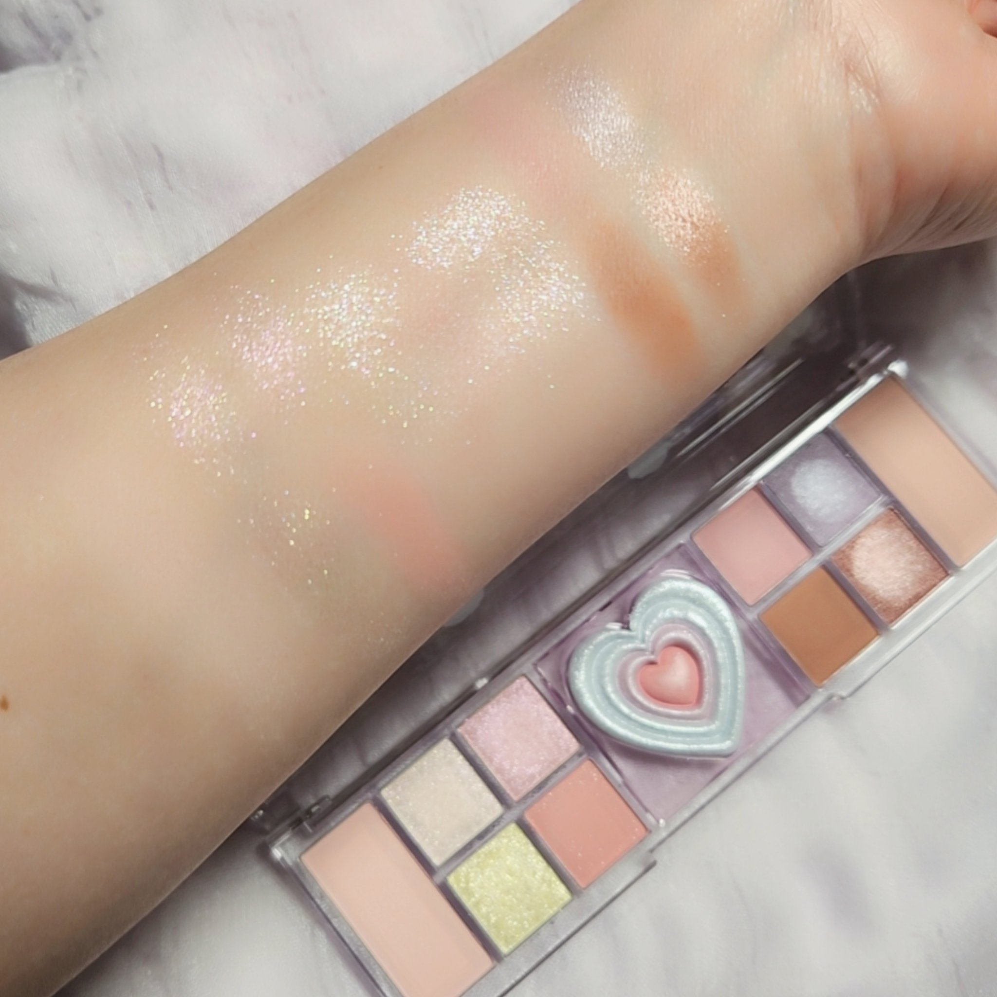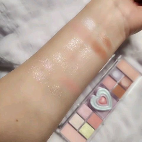 ベージュでこんな可愛くなれるんだと感動したラメ感と発色 肌に溶け込む分、どんな風に塗っても失敗しないし、自然に掘りが深い感じの目元になれる👍 ガラスパールのラメとほんのりコーラルがかったベージュで馴染みすぎず、抜け感のある雰囲気も出せて絶妙なオシャレ発色✨ ハイライトが偏光と記載があり、かなり発光します💡✨ 繊細なパールで目の下辺りとかは少し毛穴が目立つ感じもあり、マットのフェイスパウダーで調節しつつ使うとちょうど良くなりました🥰 とにかく粉がしっとりなめらかで、色の調節がしやすい❣️ 1色1色の面積もまぁまぁ大きいのでチークブラシでも取りやすく、顔全体に使えて便利🙆 日常使いしたいパレットです💕