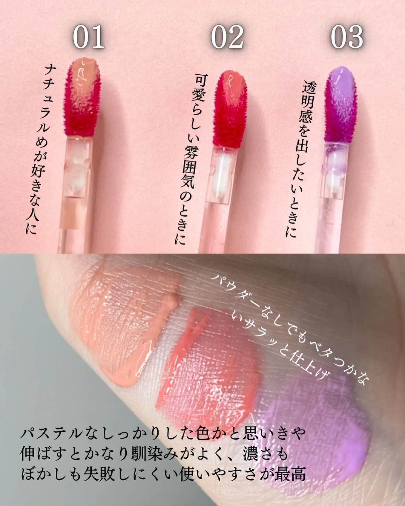 プランパーみたいなピリピリ感なく唇がちゅるっとツヤっとシワなく見えるようになるし、本当にツヤが綺麗✨ 全6色で、イエベ、ブルベに似合う色がバランスよく展開。 バズり中のうさぎ舌概念は01🐰 バレエコア好きさんは02, 05をチェック🩰 個人的には04がツボ!