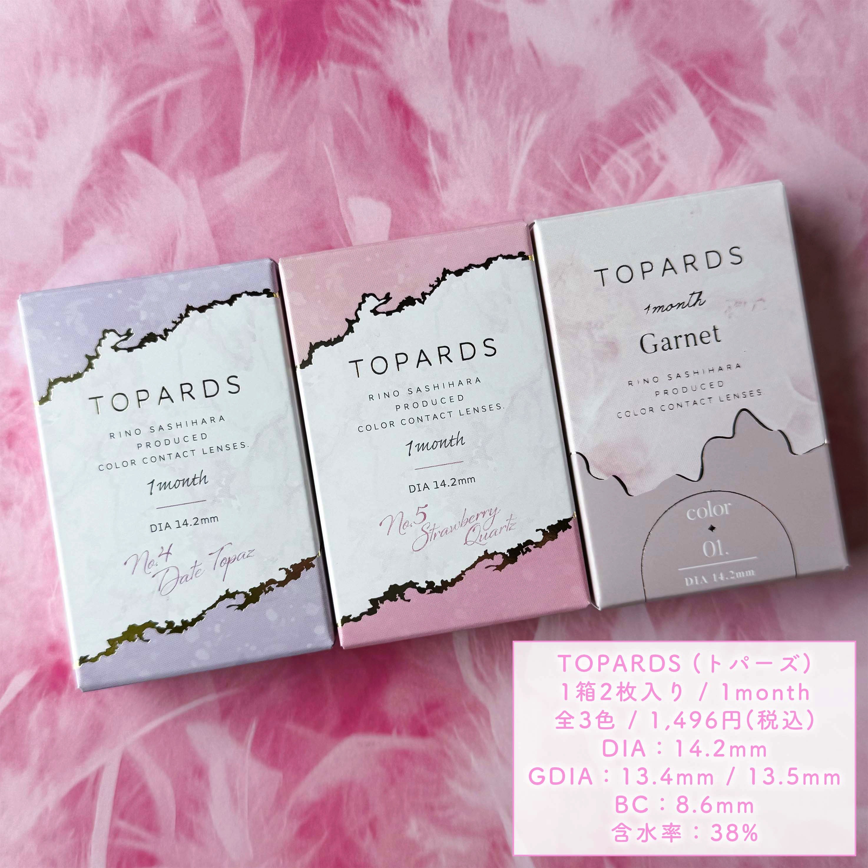 - ※2025年6月以降、商品パッケージ裏面・側面の一部表記を順次変更いたします。尚、これにかかる商品の交換・返品は承っておりません。 『TOPARDS(トパーズ)』は、透明感とうるおいのある瞳にこだわって開発されたカラーコンタクトレンズブランドです。 うるうる・キラキラした瞳に映り、どんなシーンにも馴染んでくれる商品となっております。 Date Topaz(デートトパーズ) DIA:14.2mm/着色直径13.4mm 着けてるとバレにくくこっそり可愛いが仕込めるふんわりデザイン。 Strawberry Quartz(ストロベリークォーツ) DIA:14.2mm/着色直径13.5mm ブラウンカラーにピンクをほんのりプラス。 着けることで一気に甘い顔にみせるレンズ。 Garnet(ガーネット) DIA:14.2mm/着色直径13.5mm ハイライトカラーが、ヘルシーな血色感と輝きをプラス。 洒落感ライトブラウン。 Cream Rose(クリームローズ) DIA14.2mm/着色直径13.4mm まろやかピンクが上品かわいいちゅるんローズブラウン。 Mocha Ring(モカリング) /DIA14.5mm/着色直径13.7mm くりっとフチで甘さたっぷりの瞳♡愛されモカブラウン。 Jelly Quartz(ゼリークォーツ) /DIA14.2mm/着色直径13.6mm ぼかし細フチでぷるんと輝く瞳に、毎日使いたくなる引き算大人盛れレンズ。 カラーコンタクトレンズの不適正使用による眼障害の危険性等などがあります。 ●コンタクトレンズは高度管理医療機器です。不十分な洗浄・消毒など不適切なケアや、長時間・交換期間を超えた装用により、アレルギー性結膜炎、角膜感染症、角膜潰瘍等の重篤な眼障害が発生する危険性があります ●ご使用前に取扱説明書を確認してください 使用上の留意事項 ●眼科医院等を受診してからお求めください ●眼に異常を感じたら直ちにレンズ使用を中止し、お近くの眼科等で診察を受けてください ●医師の指示にしたがってご使用ください ●コンタクトレンズを装用する場合、自覚症状がなくても、眼科医院等での定期検査を受けてください ●レンズに不具合がある場合は使用しないでください