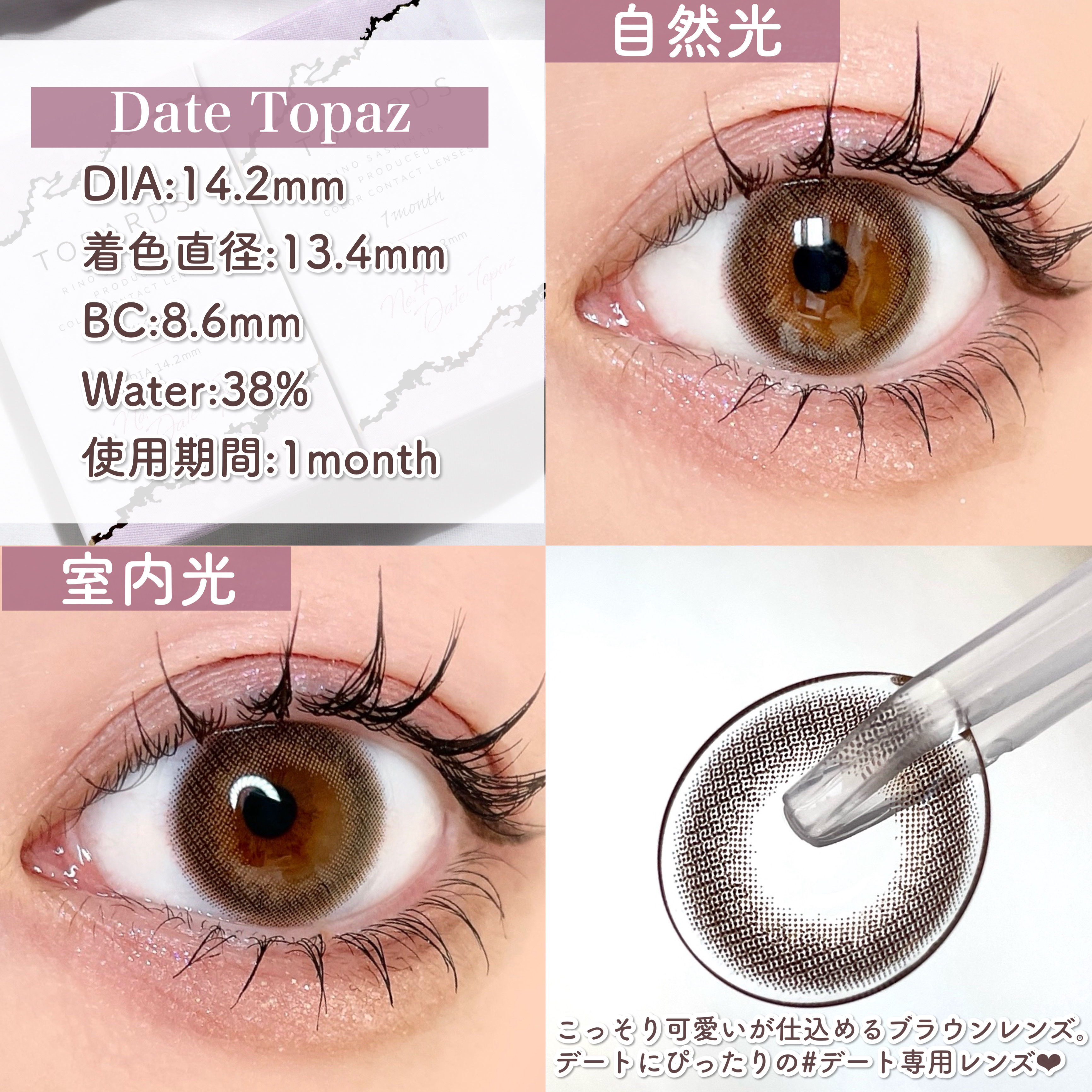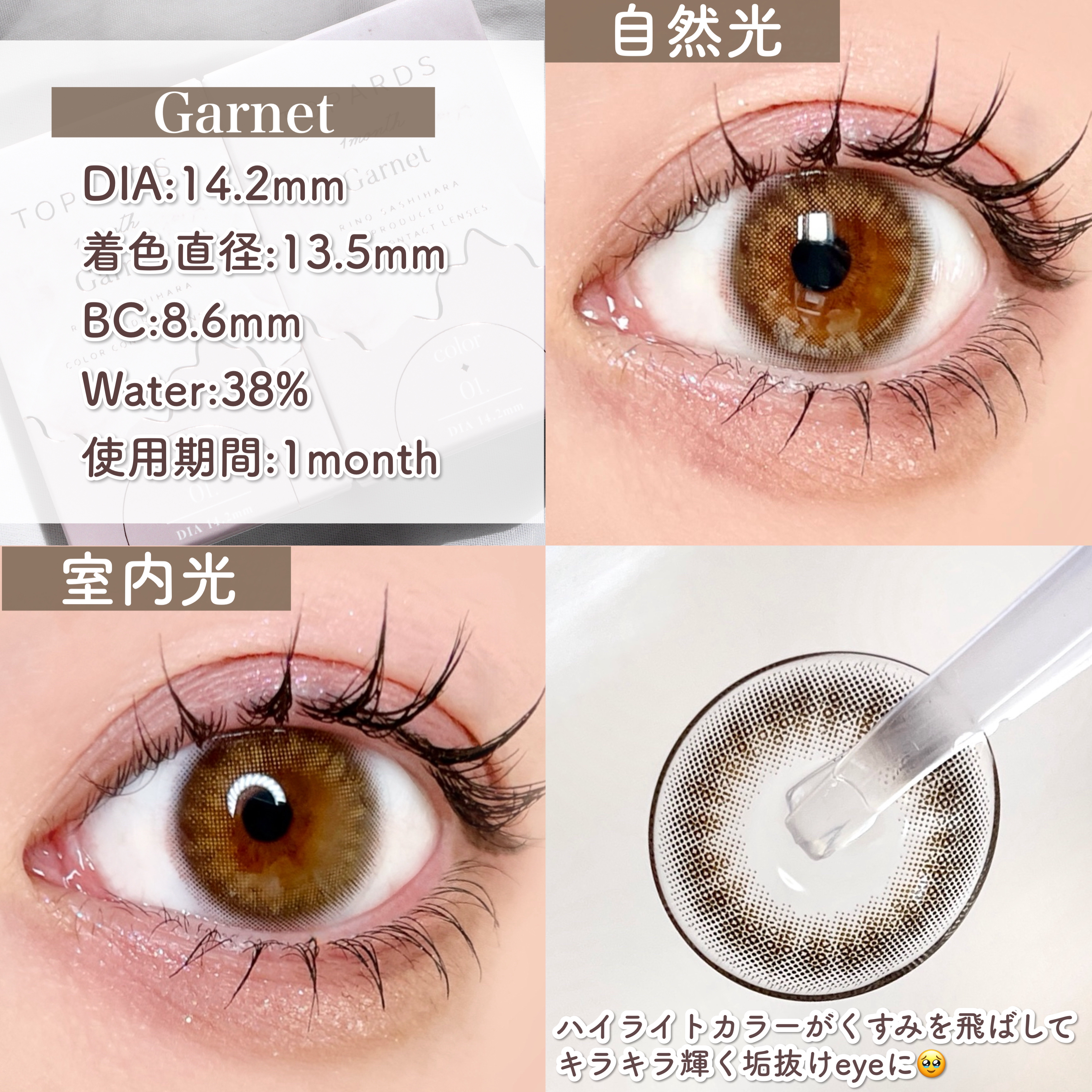 - ※2025年6月以降、商品パッケージ裏面・側面の一部表記を順次変更いたします。尚、これにかかる商品の交換・返品は承っておりません。 『TOPARDS(トパーズ)』は、透明感とうるおいのある瞳にこだわって開発されたカラーコンタクトレンズブランドです。 うるうる・キラキラした瞳に映り、どんなシーンにも馴染んでくれる商品となっております。 Date Topaz(デートトパーズ) DIA:14.2mm/着色直径13.4mm 着けてるとバレにくくこっそり可愛いが仕込めるふんわりデザイン。 Strawberry Quartz(ストロベリークォーツ) DIA:14.2mm/着色直径13.5mm ブラウンカラーにピンクをほんのりプラス。 着けることで一気に甘い顔にみせるレンズ。 Garnet(ガーネット) DIA:14.2mm/着色直径13.5mm ハイライトカラーが、ヘルシーな血色感と輝きをプラス。 洒落感ライトブラウン。 Cream Rose(クリームローズ) DIA14.2mm/着色直径13.4mm まろやかピンクが上品かわいいちゅるんローズブラウン。 Mocha Ring(モカリング) /DIA14.5mm/着色直径13.7mm くりっとフチで甘さたっぷりの瞳♡愛されモカブラウン。 Jelly Quartz(ゼリークォーツ) /DIA14.2mm/着色直径13.6mm ぼかし細フチでぷるんと輝く瞳に、毎日使いたくなる引き算大人盛れレンズ。 カラーコンタクトレンズの不適正使用による眼障害の危険性等などがあります。 ●コンタクトレンズは高度管理医療機器です。不十分な洗浄・消毒など不適切なケアや、長時間・交換期間を超えた装用により、アレルギー性結膜炎、角膜感染症、角膜潰瘍等の重篤な眼障害が発生する危険性があります ●ご使用前に取扱説明書を確認してください 使用上の留意事項 ●眼科医院等を受診してからお求めください ●眼に異常を感じたら直ちにレンズ使用を中止し、お近くの眼科等で診察を受けてください ●医師の指示にしたがってご使用ください ●コンタクトレンズを装用する場合、自覚症状がなくても、眼科医院等での定期検査を受けてください ●レンズに不具合がある場合は使用しないでください
