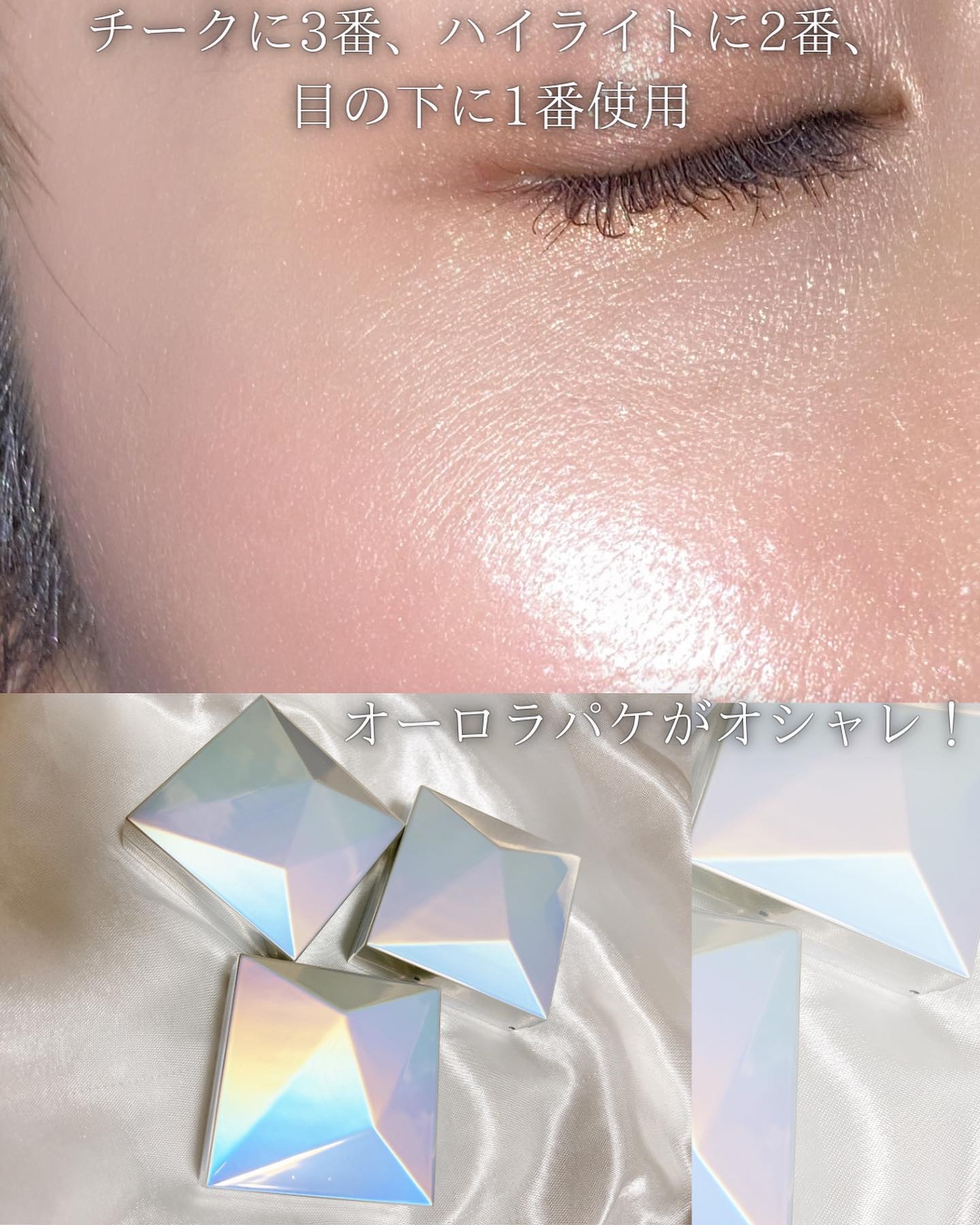 01ホワイトパール白いパール系塗ると真っ白にならなくてグロッシーで立体感を演出してくれるよすべての方に 02 シャンパンゴールド系強くないゴールドがゴージャス感でるイエベ向け 03ピンク青みかかったピンクでホワイトパールが美しいチークにするとかわいい💕 すべてグリッターが程よく散りばめられていて、ハイライト好きにはたまらない❣️ 海外コスメのハイライトのようにゴージャス感はあるけど、ギラギラしすぎず日本人の肌の色にも馴染むカラーだと思う✨