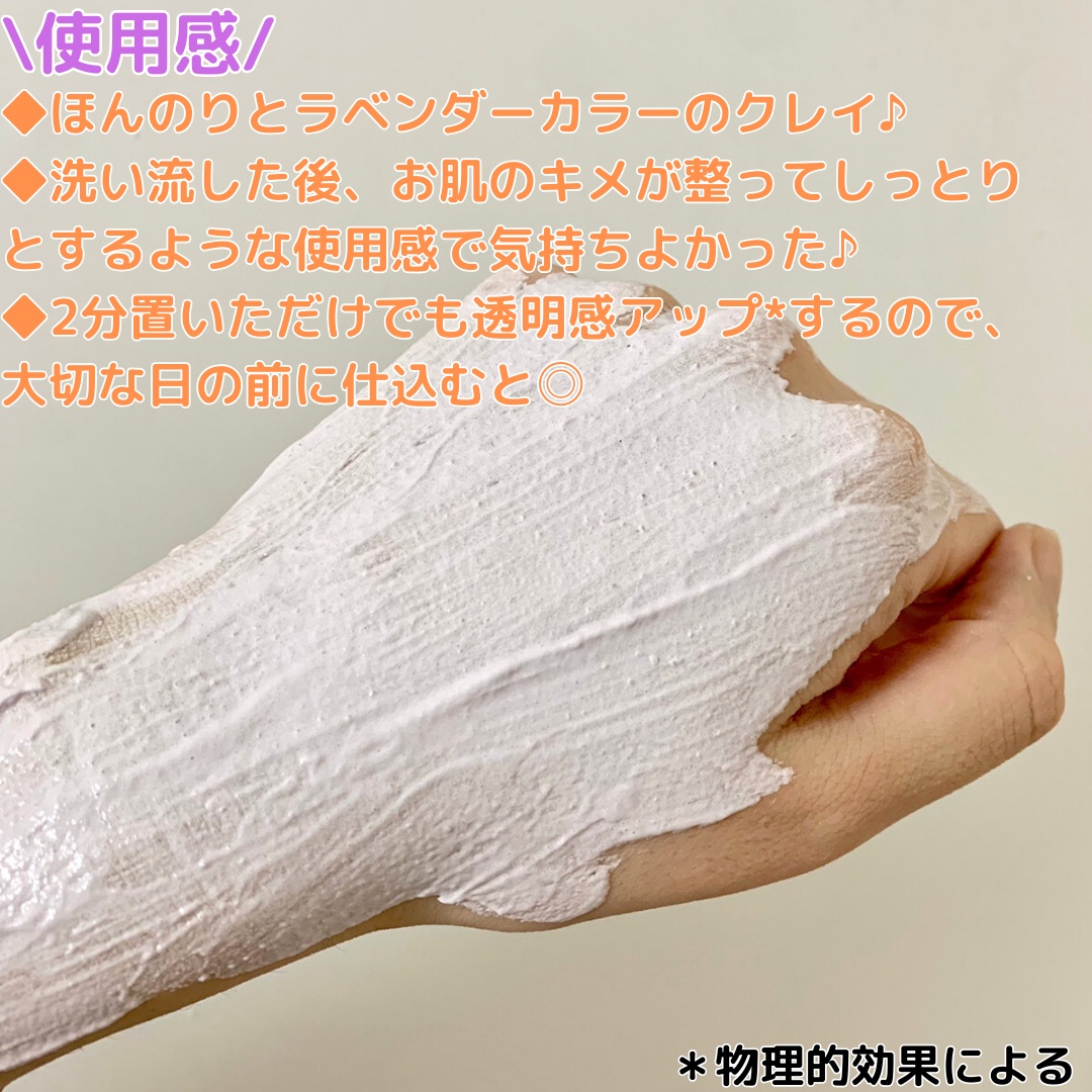 Point.1/ くすんだお肌をラベンダーカラーで補正*1しワントーン明るいお肌に! 気になる黒ずみにも◎ Point.2/ こんにゃくスクラブ*2で角質ケア! 天然由来のスクラブで古い角質をオフし、ごわついたお肌をなめらかに◎ パックは5分~10分くらい塗ったままにしておかないといけない製品が多い中、2分でOKなのはありがたい◎