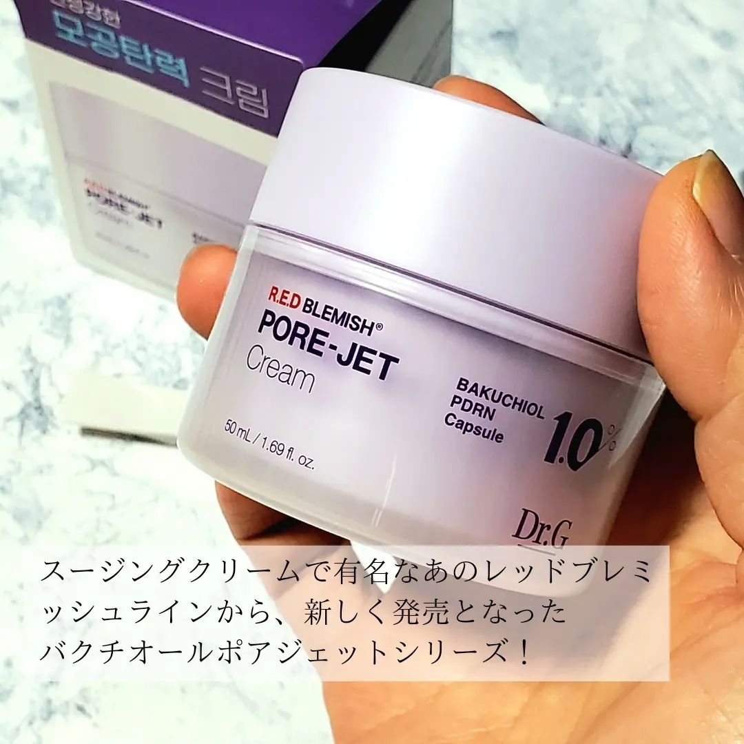 レッドブレミッシュバクチオールポアジェットクリームは、バクチオールを使った弾カケアから肌トーン・キメまでケアし、お肌を落ち着かせながら強い効果をもたらし、特に毛穴のケアに効果的なクリーム☺️✨ 韓国の超有名インフルエンサーのLeoJさんと共同開発された商品だよ😆💖 毛穴よりも2600倍小さいエクソソームでしっかり角質層まで浸透✨ ビタミンC誘導体やナイアシンアミドも配合で美白ケアにも☺️💕
