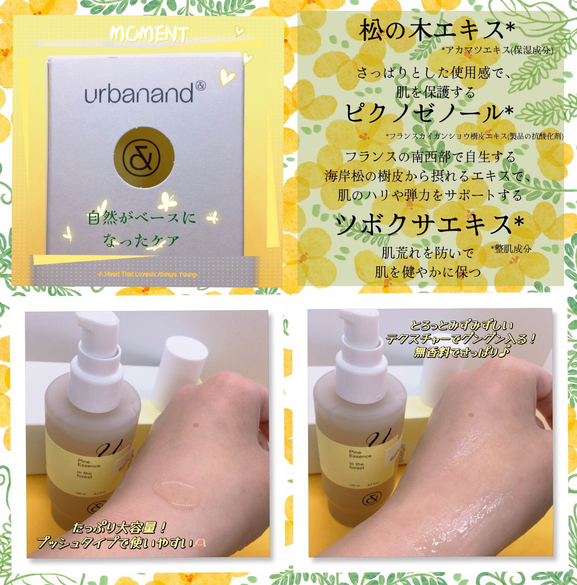 松の木エキスは肌の老廃物をケアしながら清涼感を与えてくれるんだとか。 敏感肌、乾燥肌向けに作られたエッセンスで、肌荒れ期など肌の調子が悪い時に使うのもおすすめ。 松の木エキスだけでなく、ピクノゼノール、ツボクサエキスも配合。 蓋を取るとポンプ式になっているので使いやすさ◎ すべすべマットなパケで握り心地も良いです😂💖 とろっとしていますが肌にすっとなじみます。べたつきはなし。 皮膚低刺激テスト済みなのも嬉しいポイント。 アーバンアンドの製品はどれもパケや販売ページの写真がとってもおしゃれ🥹 デザインスタジオや写真家の方と協業しているそうで、こだわりを感じます。