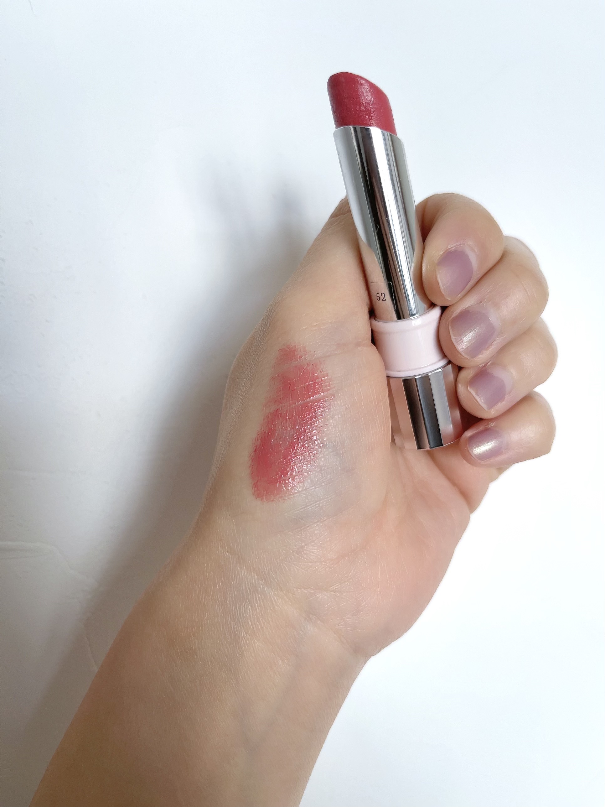 これ使ってみたけど粘膜色で落ち着いたピンク。とっっっても使いやすい色でした! グリーンパール(ラメ)入りだそうで肉眼でみると細かいラメが見えますが実際に塗ってみると唇をよーくみてもあまりよくわからないくらいのラメでした。 使いやすく可愛いのでオススメです!