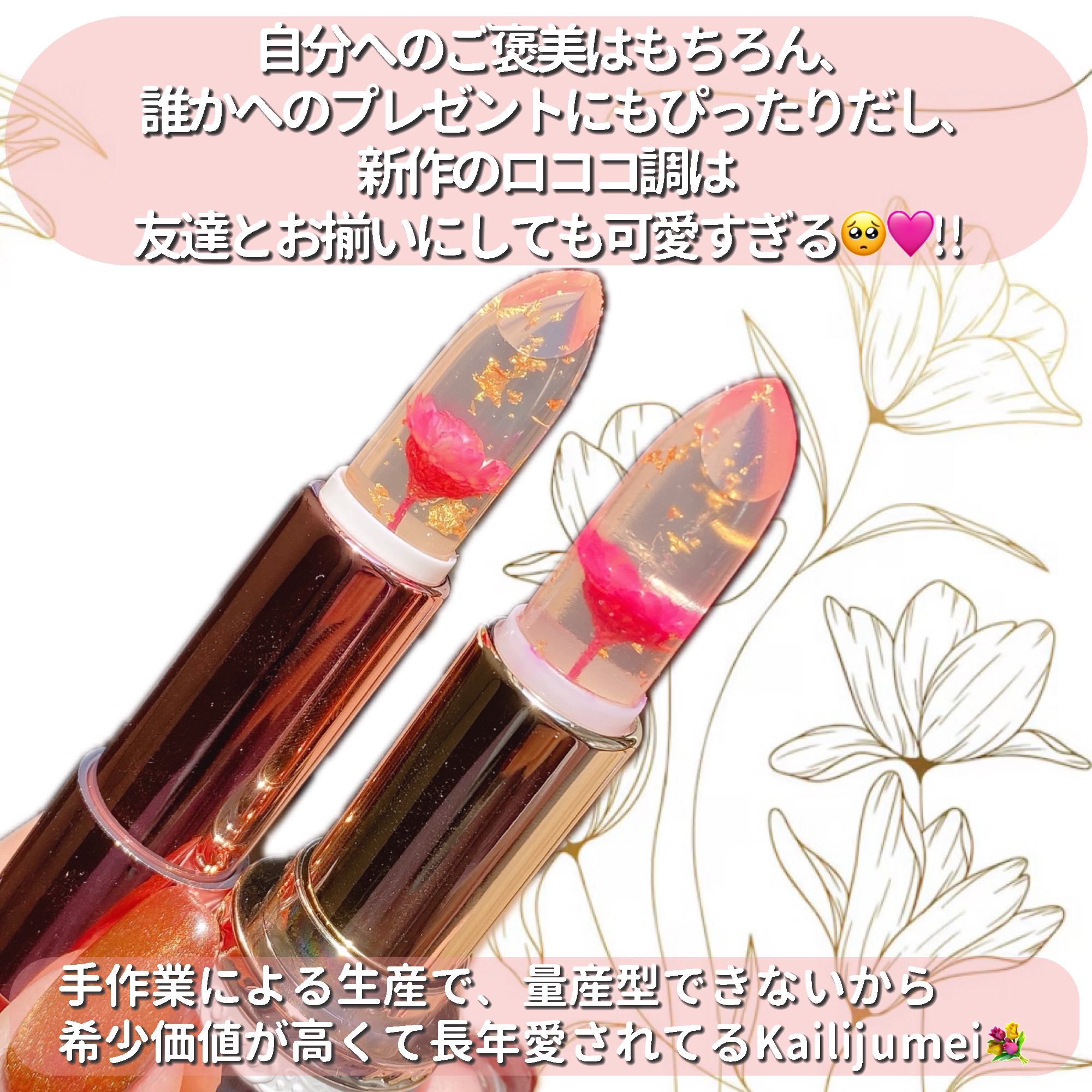 - 〈日本限定モデル〉氷の中で儚げに咲く一輪の花からインスパイアされた「カイリジュメイ フラワーリップ」。唇の水分・体温・pHに反応して、あなただけの色に染まるマジックカラーティントです。 本物の小さな花を手作業で閉じ込めたリップは、世界に同じものが一つとしてない、唯一無二の個性を秘めています。花の周りを煌びやかに舞うのは、純度99%の金箔。手作業であるがゆえに発生する細やかな気泡はリップがもつ個性を強め、神秘的な美しさを作り上げます。 手に取った瞬間にときめきが溢れ出し、思わず微笑んでしまうような、そんな幸せな時間をあなたに提供します。 <マジックカラーティント> 唇の水分・体温・pHに反応して、一人一人異なる色に変化する不思議なリップ。あなただけのナチュラルなピンクに発色するため、肌色を選ばず使いやすいアイテムです。リップの色選びに悩む必要もありません。落ちにくいティント処方で、マスク着用時や飲食時もメイク落ちを気にせず、あなただけのリップカラーを楽しむことができます。色落ちしやすい口紅の下地としてもおすすめです。 また、「フルールロココ フラワーリップ」は、植物由来の天然保湿成分*を配合した、高品質な日本限定のハイエンドモデルです。 ・天然成分*(オリーブ果実油、ブドウ種子油、ホホバ種子油、ラベンダー油/保湿)配合 ・トコフェロール配合(ビタミンE/保湿) ※リップの中のお花は本物のドライフラワーのため個体差がございます。写真と全く同じではないことをご了承ください。