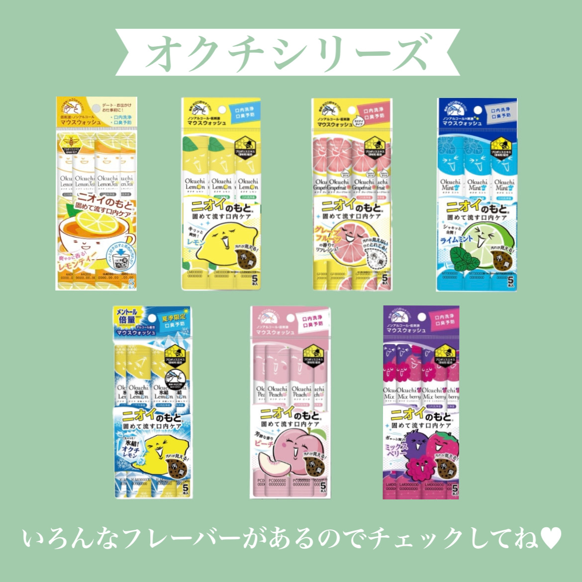 選べる福袋で、お店にあった全種類のオクチシリーズを購入🛒 1袋分264円×5袋1320円が1050円❣️ サンプルも付けてくれました 口の中の汚れ、磨き残しを除去し、口臭の原因の一つであるタンパク質を固めて洗い流す口内洗浄液です。 キュンと甘酸っぱいチェリー🍒 ノンアルコール・低刺激