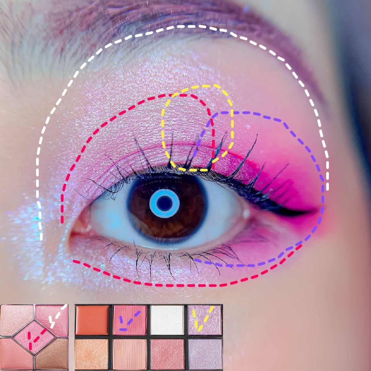 ピンクにグレージュも良いですね👌💗 今日は可愛らしい感じにしてみました💕 上下瞼黒目〜目頭側にラメを塗ってキラキラさせております🤩 目尻はマットのピンクを濃いめに重ねて💗 グレージュのアイライナーと相性◎