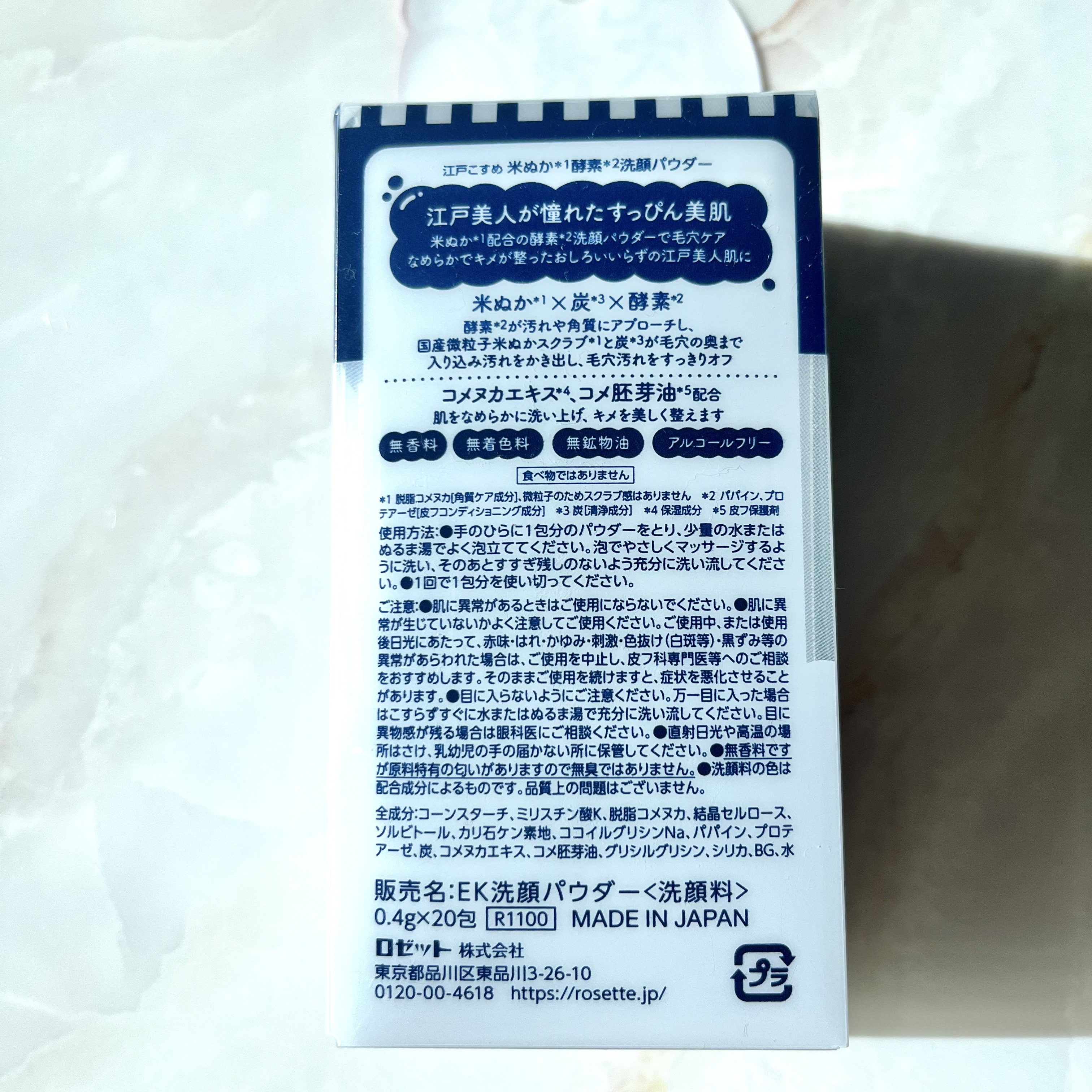 - <江戸こすめ 米ぬか酵素洗顔パウダー> コーンスターチ、ミリスチン酸K、脱脂コメヌカ、結晶セルロース、ソルビトール、カリ石ケン素地、ココイルグリシンNa、パパイン、プロテアーゼ、炭、コメヌカエキス、コメ胚芽油、グリシルグリシン、シリカ、BG、水