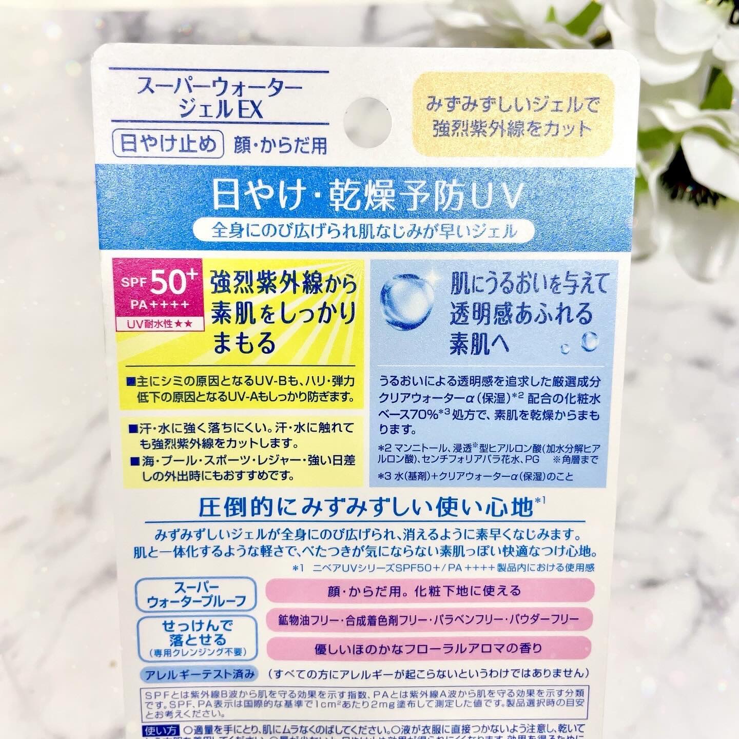 - 圧倒的にみずみずしい!(*1)消えるようになじむ 日やけ・乾燥予防UV ●圧倒的にみずみずしい!(*1) 消えるようになじむ みずみずしいジェルまたはエッセンスが全身にのび広げられ、消えるように素早くなじみます。肌と一体化するような軽さで、べたつきが気にならない素肌っぽい快適な使い心地。 ●SPF50+/PA++++/UV耐水性★★ 強烈紫外線から素肌をしっかりまもる。主にシミの原因となるUV-Bも、ハリ・弾力低下の原因となるUV-Aもしっかり防ぎます。 ●汗・水に強い 汗・水に強く落ちにくい。汗・水に触れても強烈紫外線をカットします。海、プール、スポーツ、レジャー、強い日差しの外出時にもおすすめです。 ●肌にうるおいを与えて透明感あふれる素肌へ うるおいによる透明感を追求した厳選成分クリアウォーターα(保湿)(*3)配合の化粧水ベース70%(*4)処方で、素肌を乾燥からまもります。 (*1) ニベアUVシリーズSPF50+/PA++++製品内における使用感 (*3) マンニトール、浸透(※)型ヒアルロン酸(加水分解ヒアルロン酸)、センチフォリアバラ花水、PG (※)角層まで (*4) 水(基剤)+クリアウォーターα(保湿)のこと 〇スーパーウォータープルーフ 〇せっけんで落とせる(専用クレンジング不要) 〇顔・からだ用 〇化粧下地に使える 〇鉱物油フリー、合成着色剤フリー、パラベンフリー、パウダーフリー 〇優しいほのかなフローラルアロマの香り 〇アレルギーテスト済み(すべての方にアレルギーが起こらないというわけではありません)