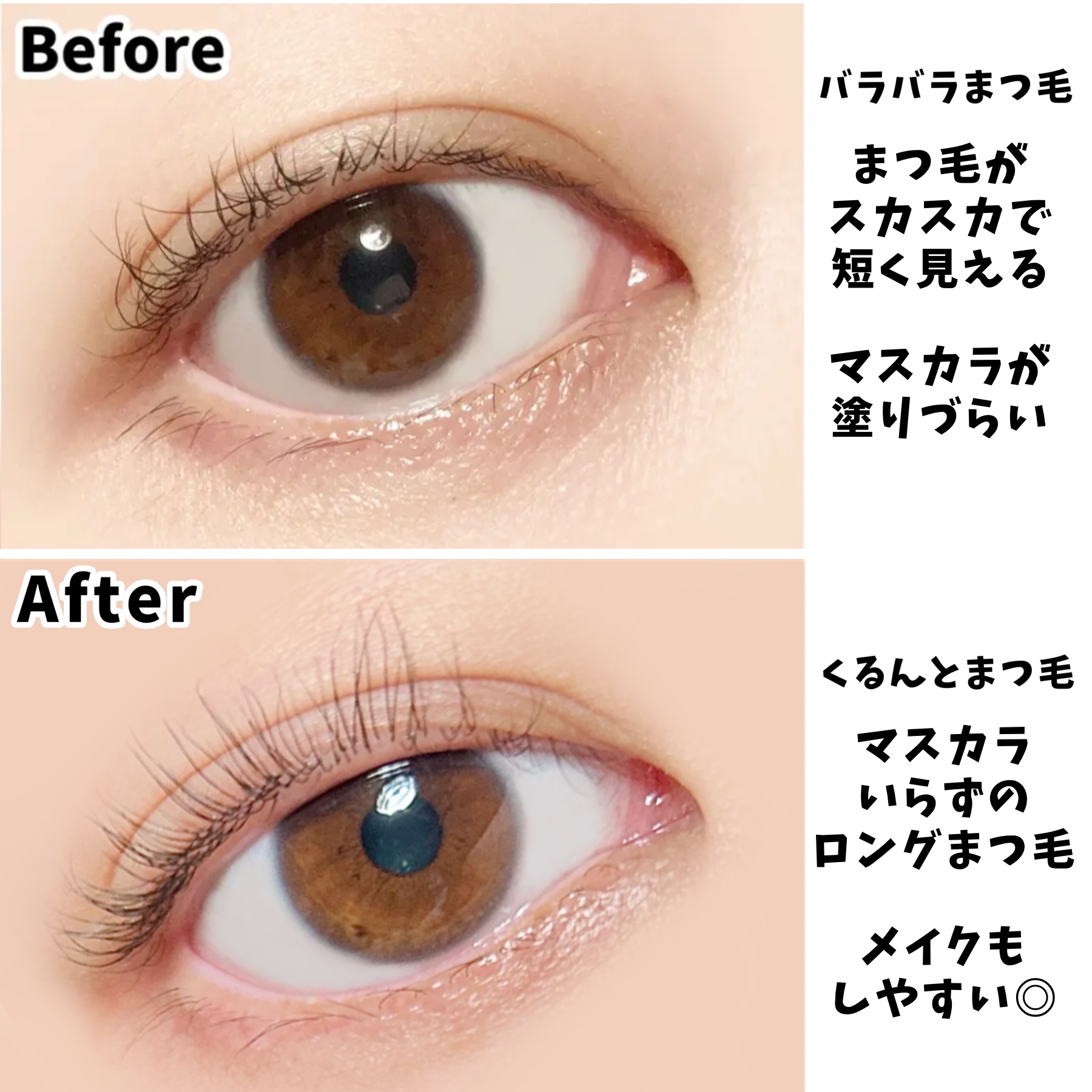 簡単な工程で綺麗な仕上がりのまつ毛になります。 不器用な私でも簡単にできたのでオススメです! サロンの予約を取らず家で空いている時間に出来る! 1箱で5回分入っているのでお得! まつパに行くまでの時間と施術料に比べれば凄くお得で嬉しい!